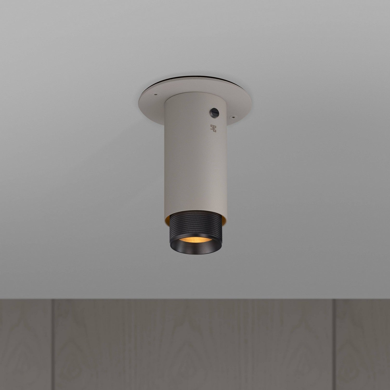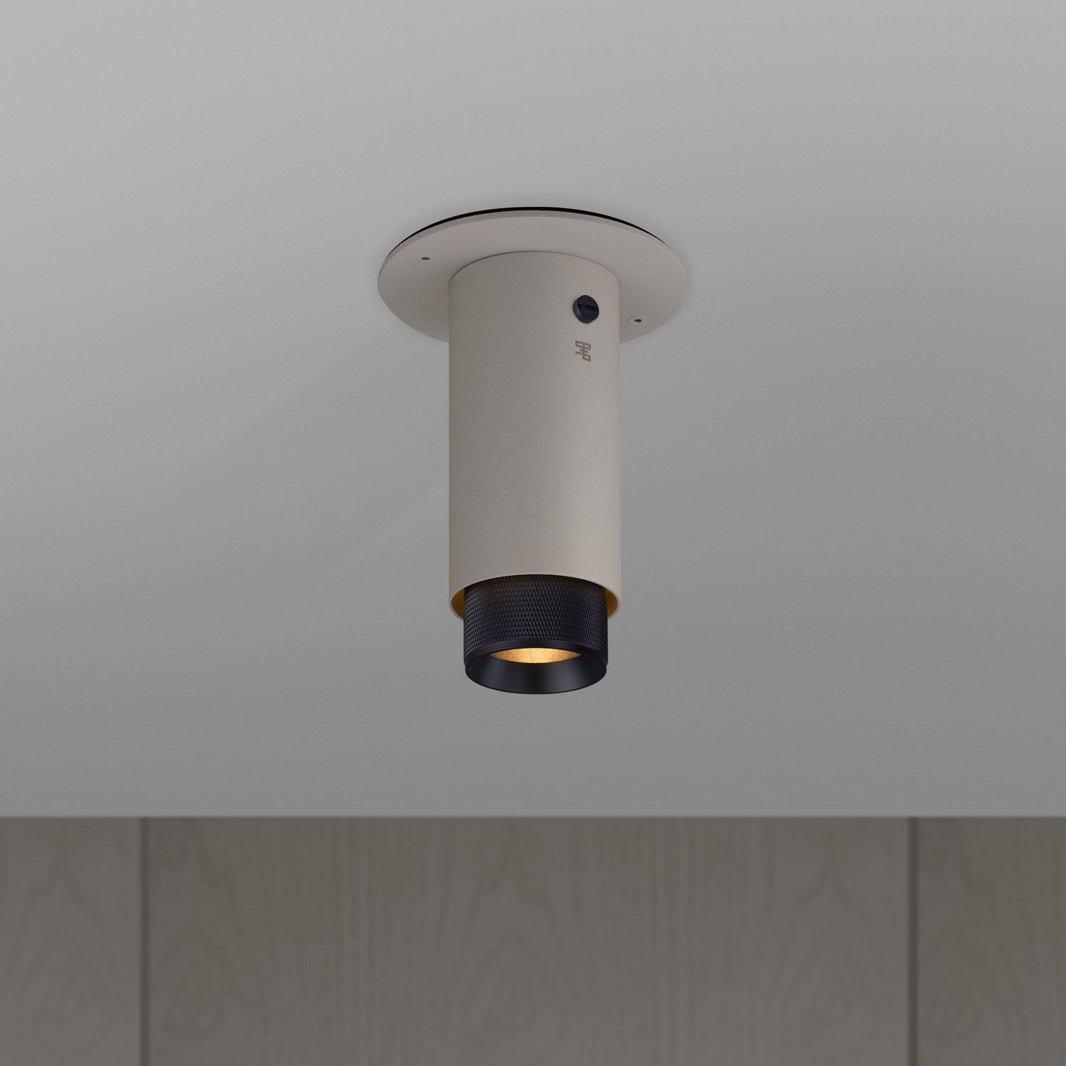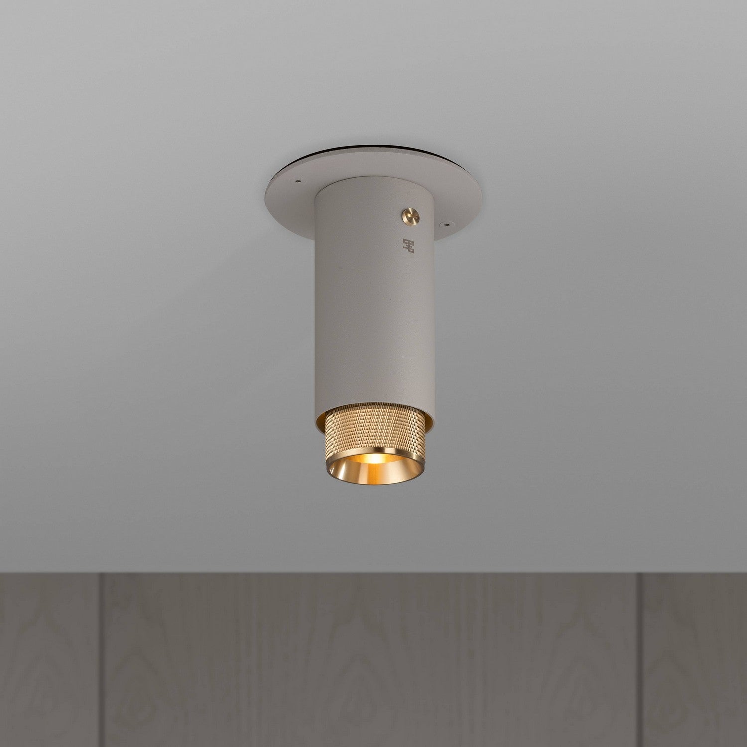 A surface mounted, fixed spotlight made from graphite powder coated metal with cross-knurled solid metal detailing.