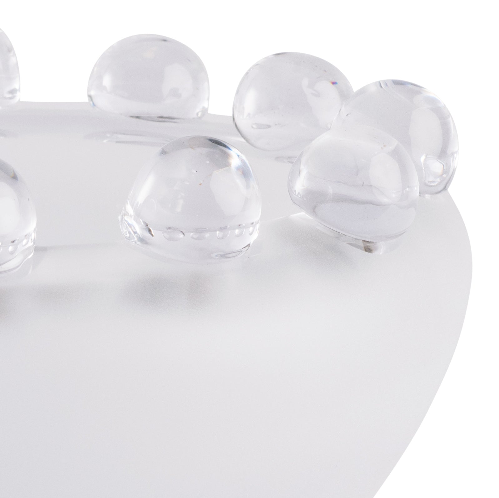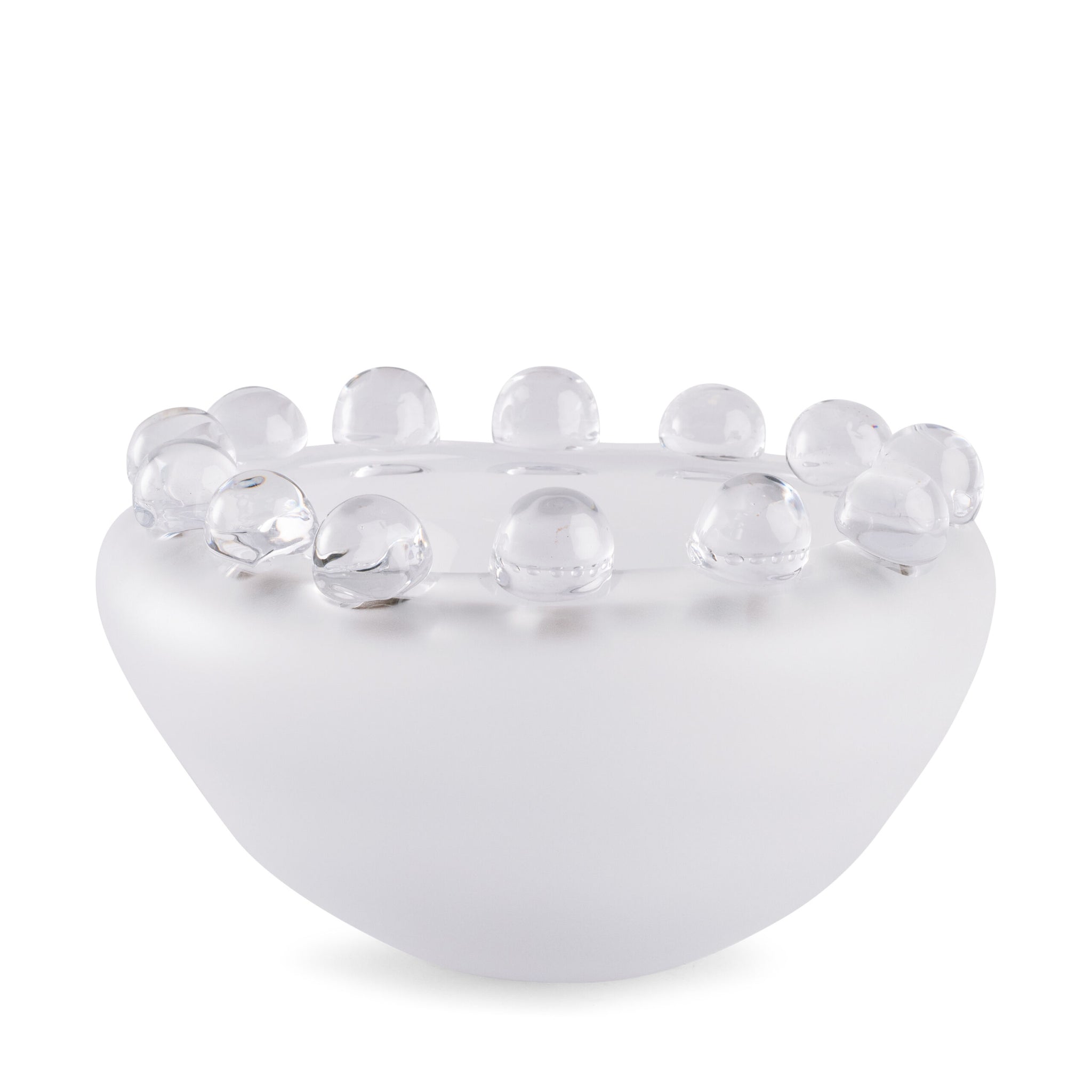 The ethereal Ruby Bowl is a weighty glass vessel with a creative combination of finishes. The body is smoothly frosted while the rim is dotted with shiny clear spheres, a refreshing duality like water and ice. Slight variations in the texture and symmetry lends artisanal charm. This neutral accent is easy to coordinate.
