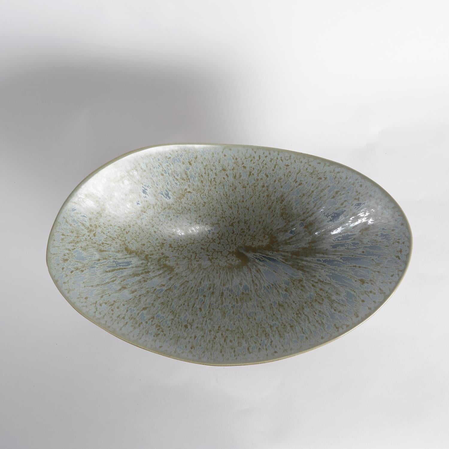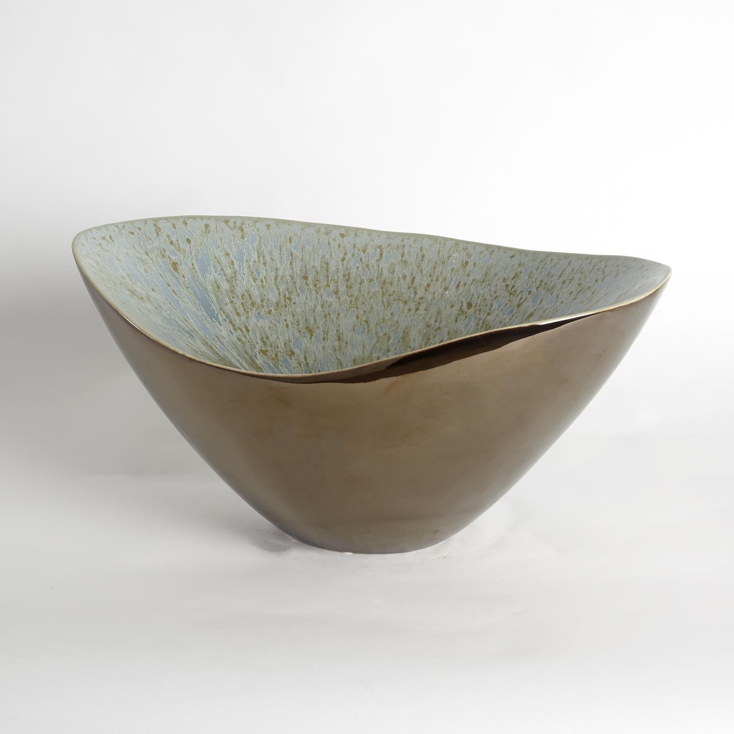 Our peek-a-boo Marta's Bowl is covered in a gleaming warm bronze glaze. The soft dip of the bowl's lip shows the contrasting soft blue reactive glaze peeking from the interior of the piece. This graceful bowl will be a welcome addition to your table top.