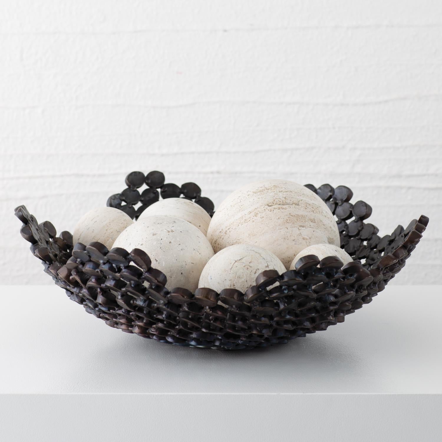 The iron "nuggets" of this collection are reclaimed scraps of metal from the factory floor which have been repurposed with great imagination. The individual pieces have been welded together in irregular shapes, then torched. Recycling at its best!