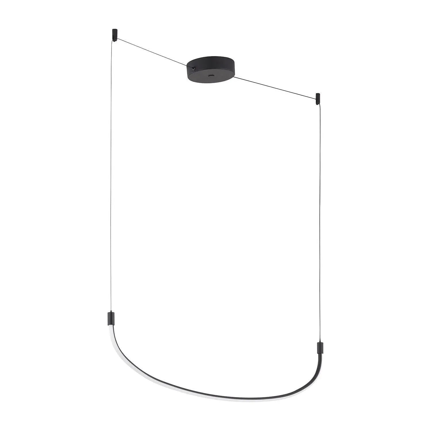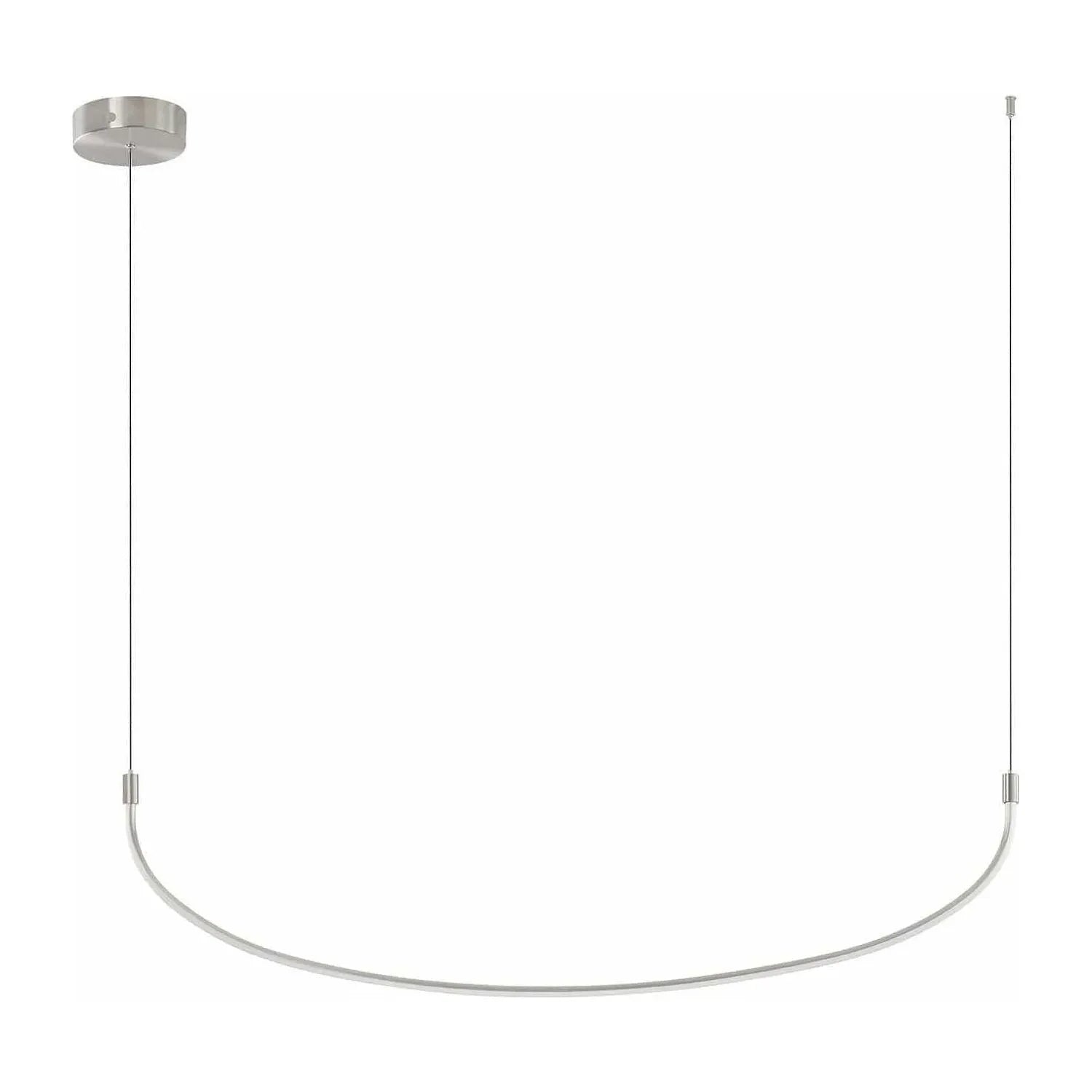 Hand-finished metal tubing forms a graceful arc suspended from two discrete cables and a slim round canopy, producing even, glare-controlled illumination along its length. The integrated LED strip delivers efficient, consistent light while maintaining a low profile and precise silhouette.