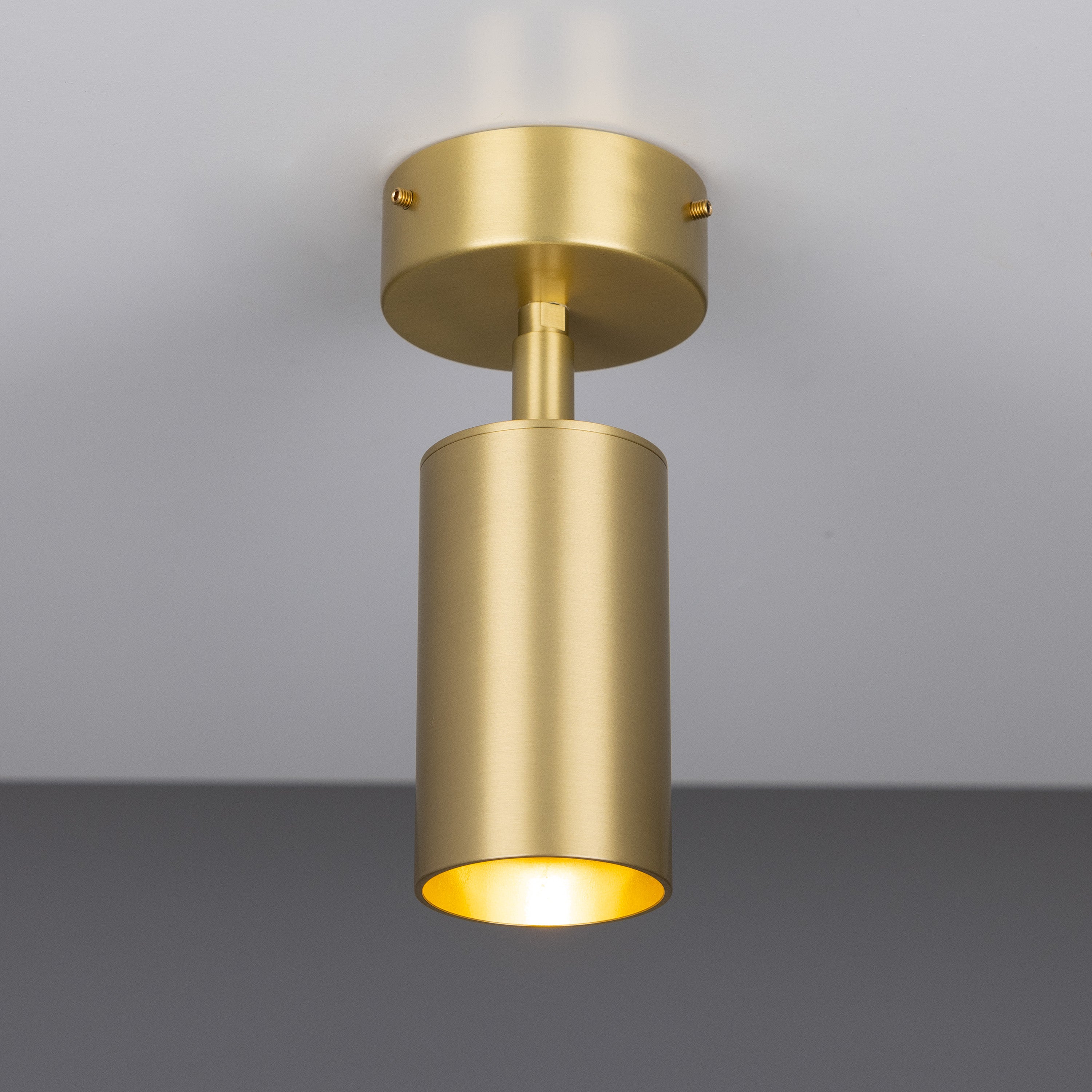Evanston Ceiling Light from Mullan Lighting is a study in refined restraint — a compact, cylindrical fixture that reads as modern hardware with the warmth of antique brass. Its pared-back form directs light downward while the subtly aged finish and gilded interior produce a focused, luminous glow ideal for curated interiors.