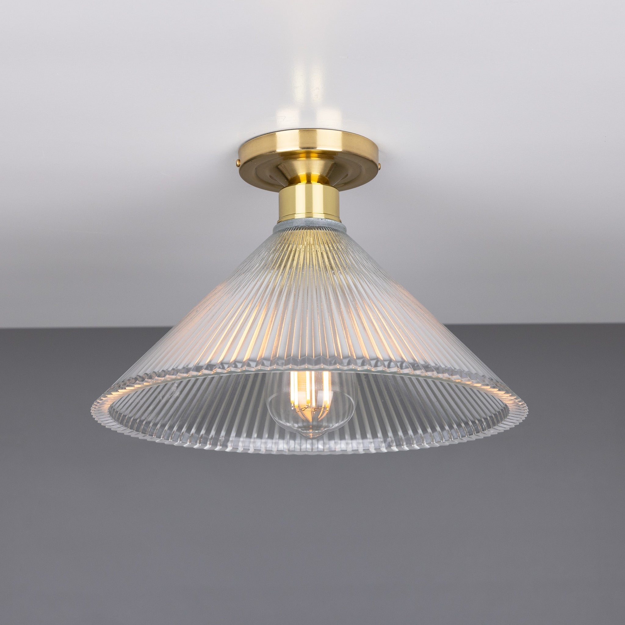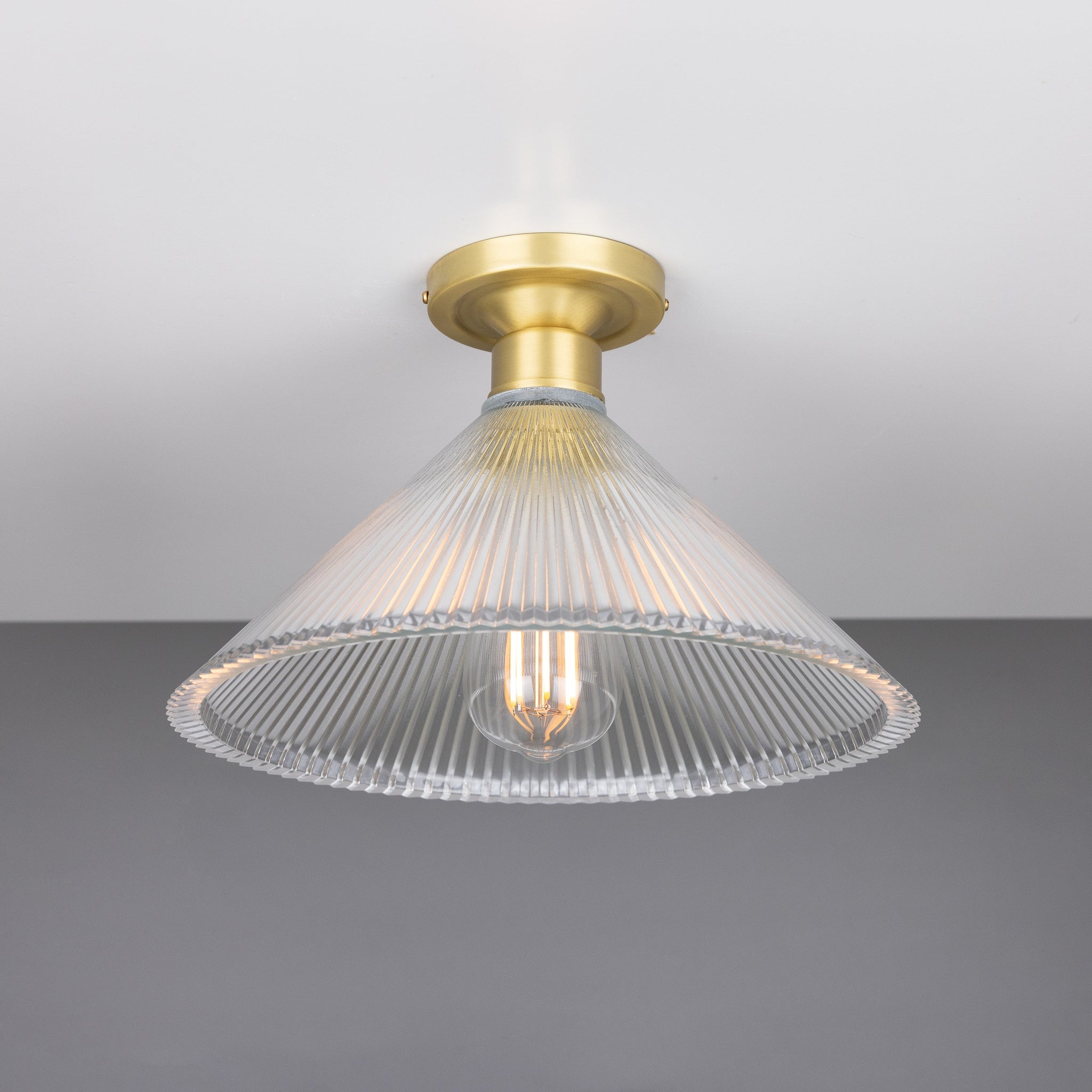 Hanoi Holophane Flush Mount by Mullan Lighting marries industrial precision with refined residential scale. A hand-cut holophane glass cone disperses light evenly with crisp, vertical ribs while the low-profile metal canopy and socket collar provide a disciplined, architectural silhouette.
