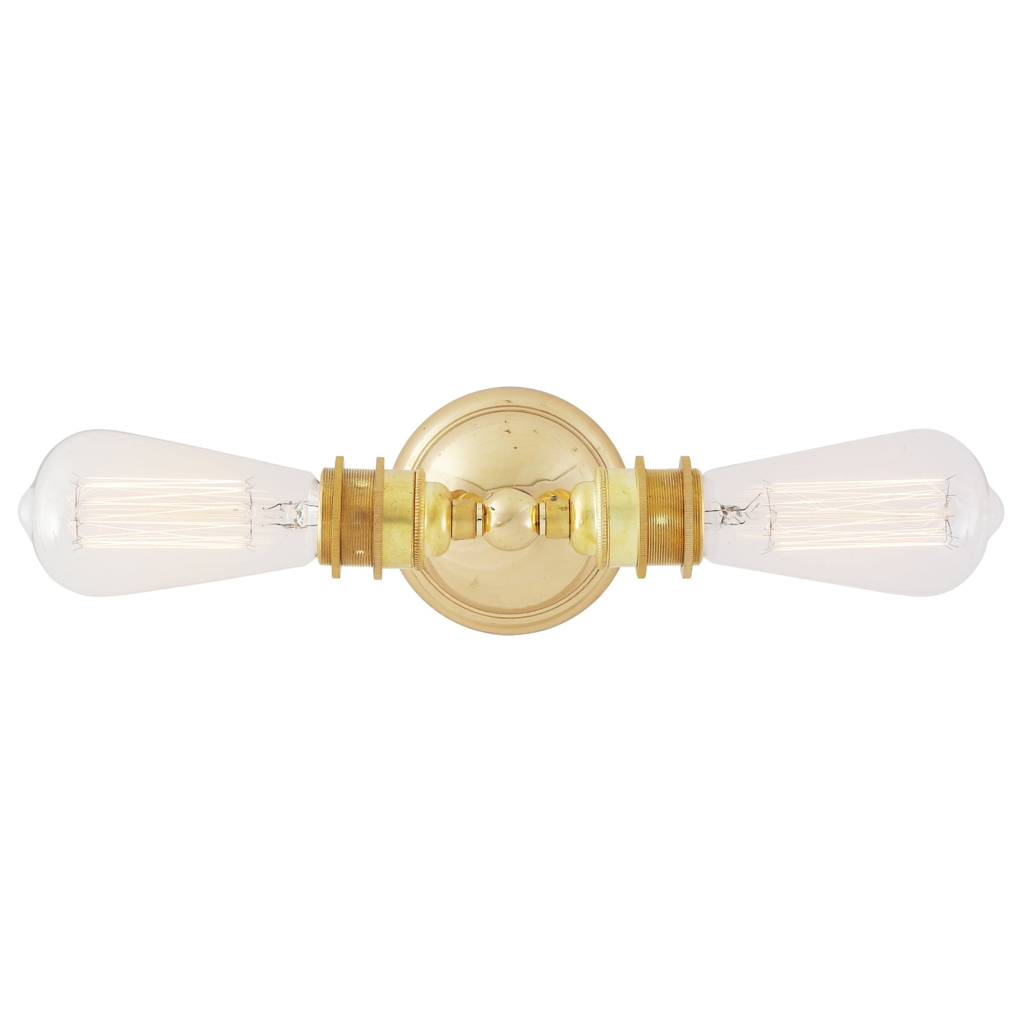 Lome Vintage Double wall light from Mullan Lighting balances curated vintage character with precise modern craft. Two exposed lamp fittings and a compact round backplate create a linear silhouette that reads equally refined in hospitality corridors, bathrooms, or above vanities.