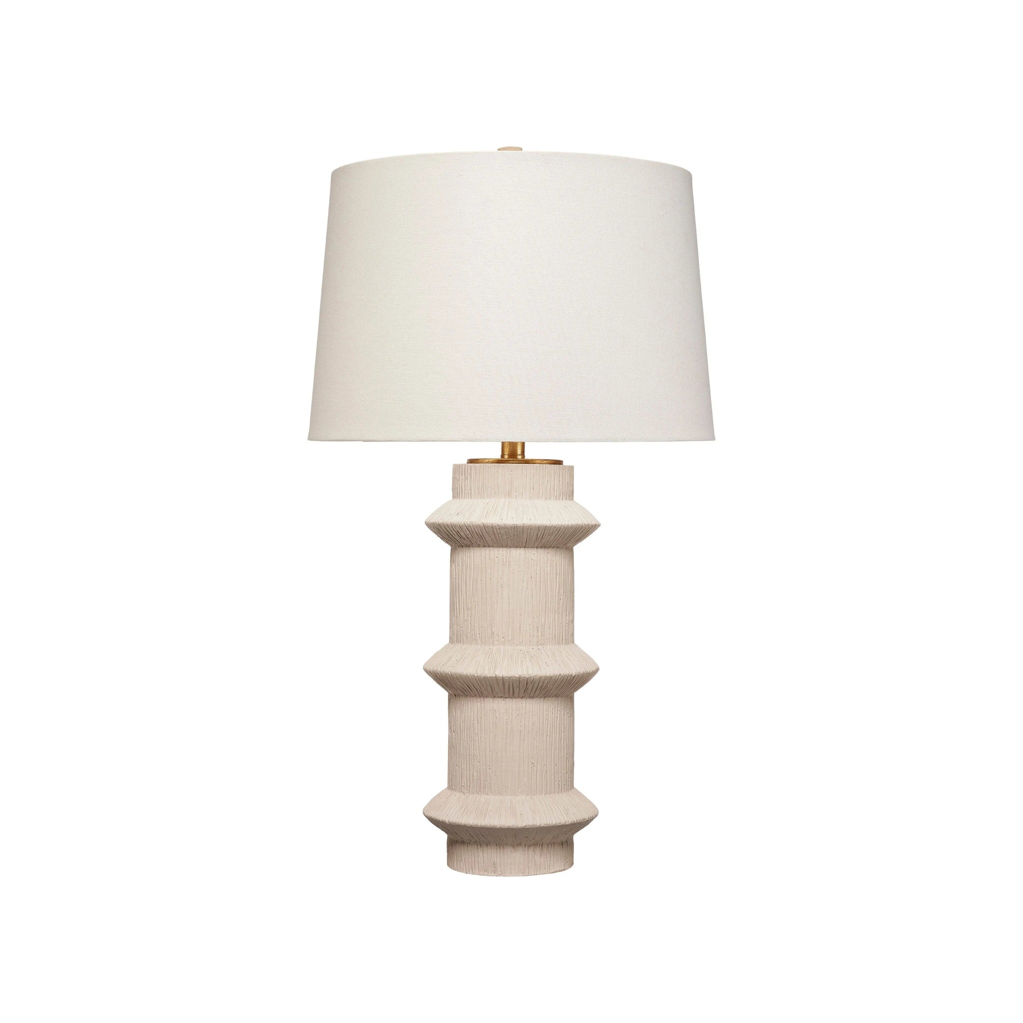 Architecturally inspired and modern in any era, this unique lamp is handcrafted with quality polyresin. Its geometric lines are enhanced by a textured cream finish and warm antique brass hardware, and it is topped with a drum shade in white linen. Place a pair on either side of a long, low console or individually next to an armchair.