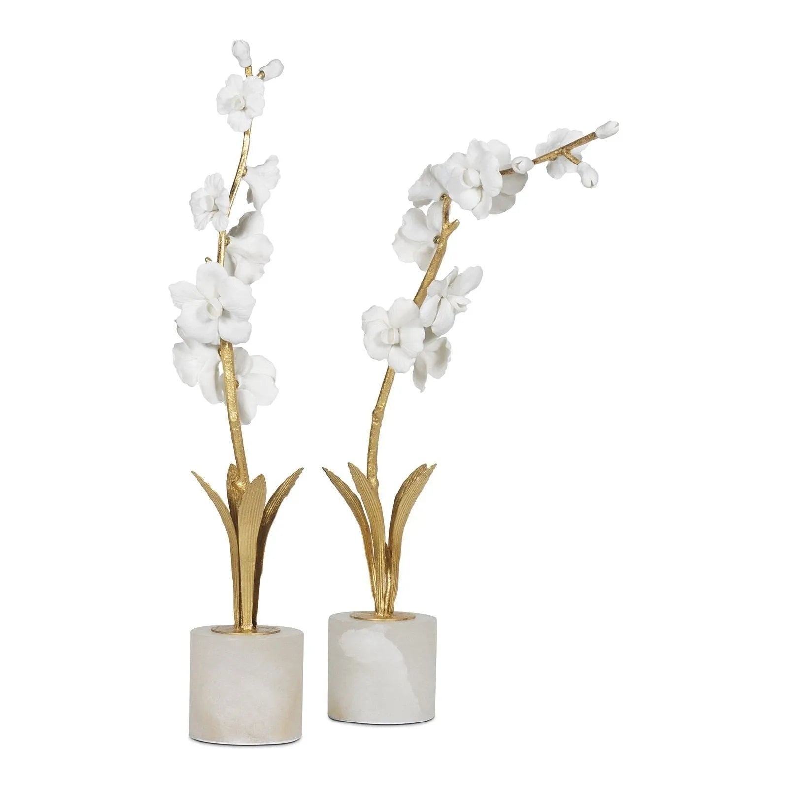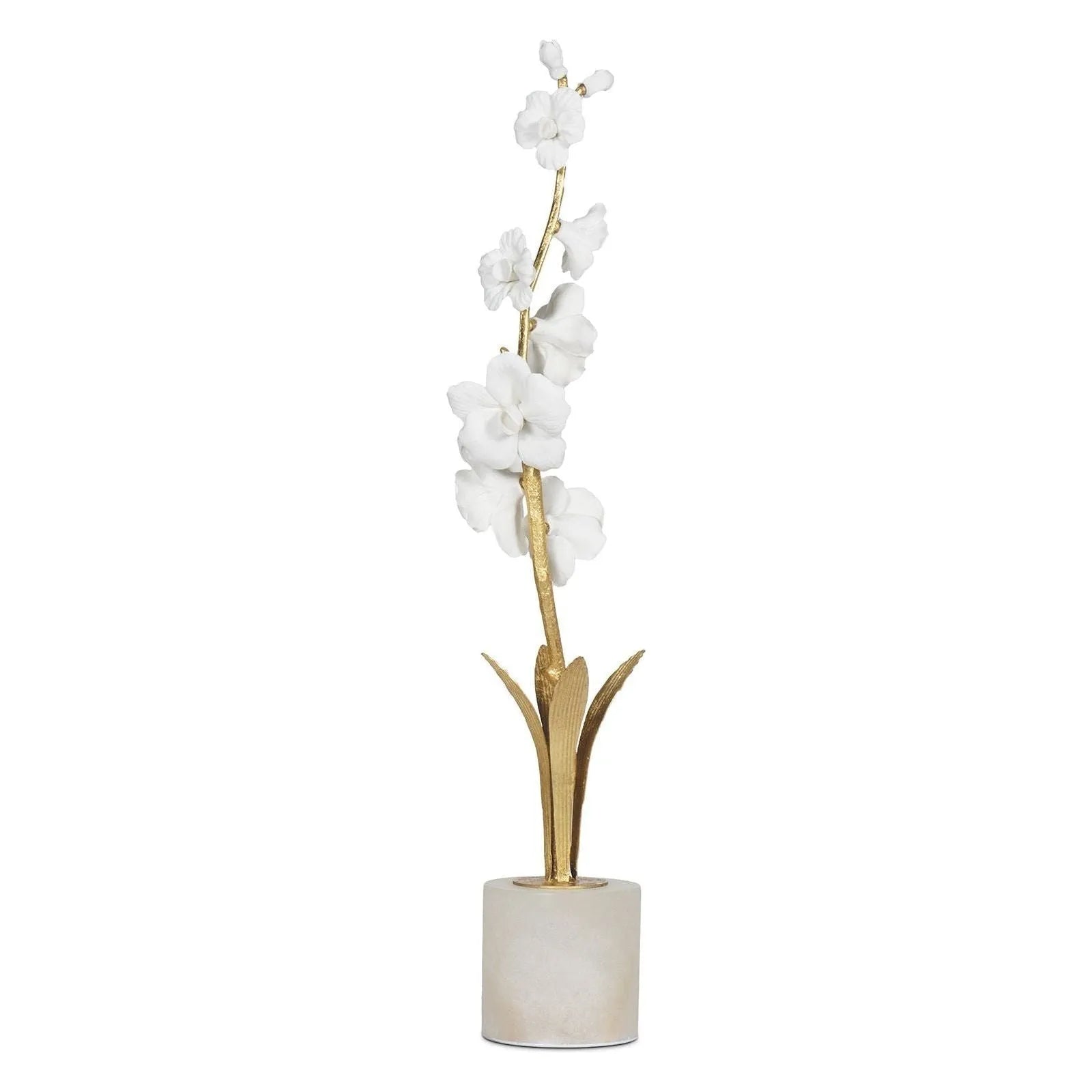 Embrace nature with the Thylane Orchid Sculpture, designed with an organic silhouette, mimicking an orchid stem curving in bloom. Resting on a solid alabaster base, this piece features delicate porcelain blossoms and stamped metal leaves finished in gold leaf. Its fluid, nature-inspired form makes it an elegant centerpiece or sculptural accent, bringing timeless beauty to any room.