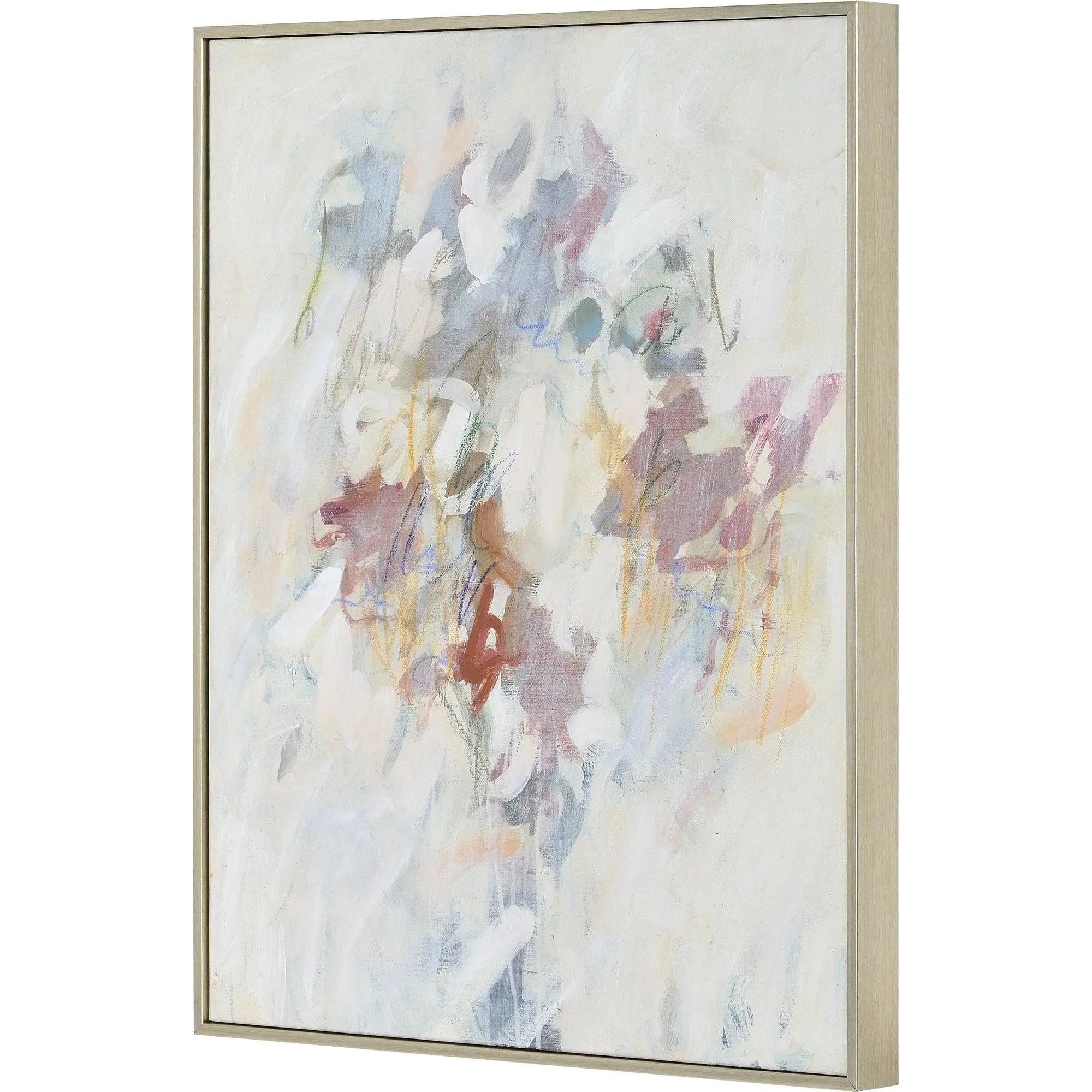 Graffiti style art gets a delicate, romantic makeover in this set of two canvas paintings. Created to be hung vertically or horizontally, each piece has its own variation on the design, allowing both to stand out. While the grey backdrop and pops of blue and green add to its beauty, the dusty rose details elevate each piece to new heights.