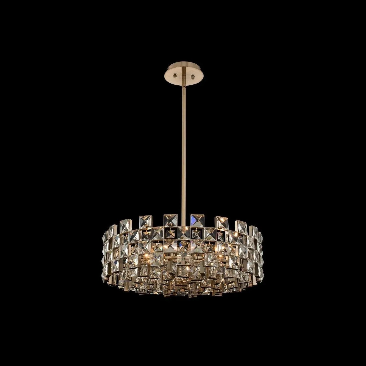 Faceted crystal squares are placed in a checkered pattern inside of a Brushed Champagne Gold frame in the Piazze Collection. The use of negative space creates a visually light look that would work perfectly in formal or more casual setting.