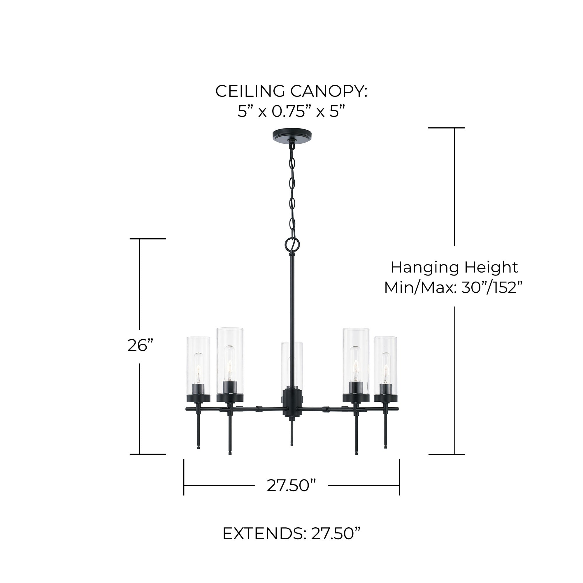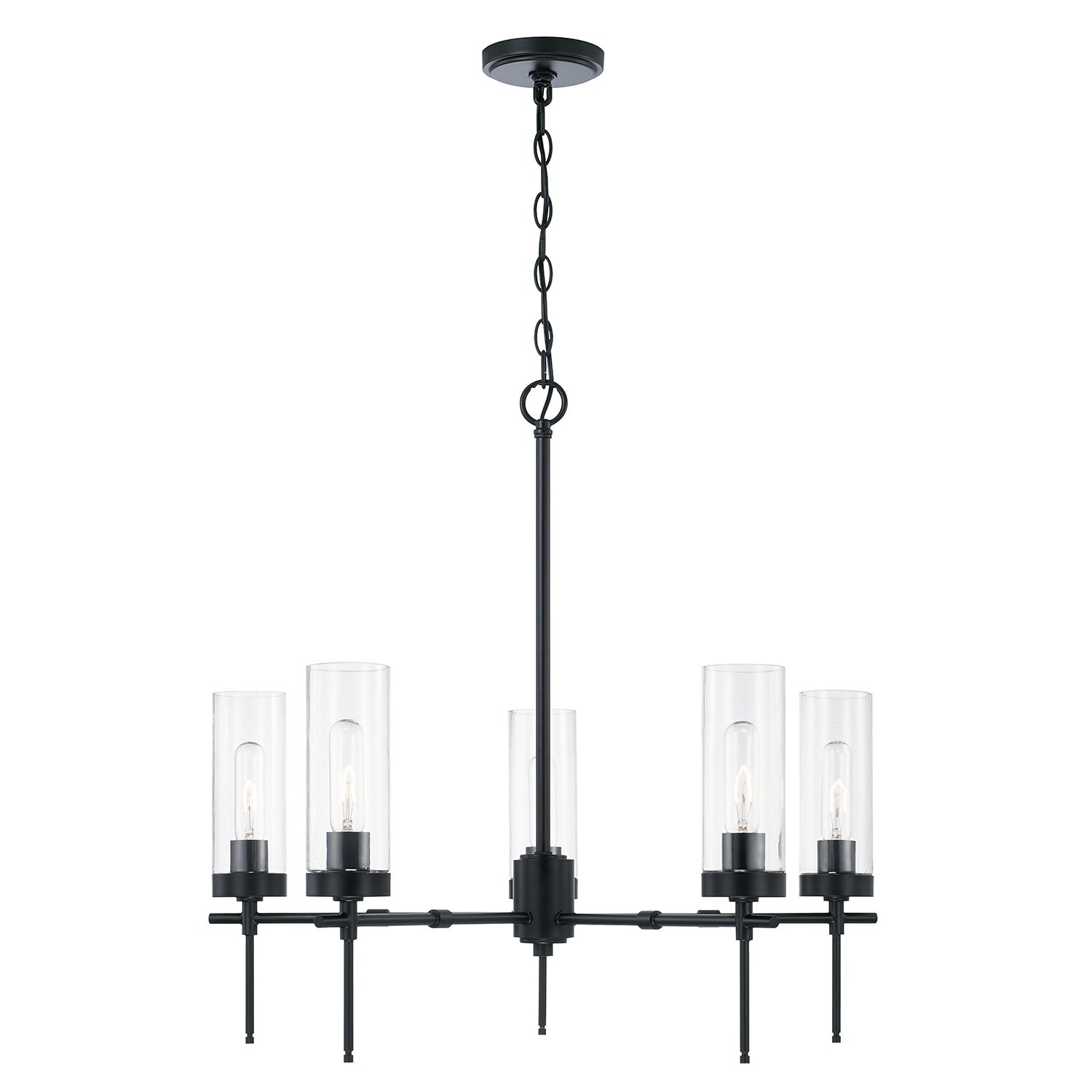 Riley Chandelier brings a sculptural focal point to your space with striking lines and pronounced details. The matte black finish adds a hint of industrial style to the modern frame and clear glass cylinders, creating a versatile lighting centerpiece that fits both contemporary and transitional interiors.