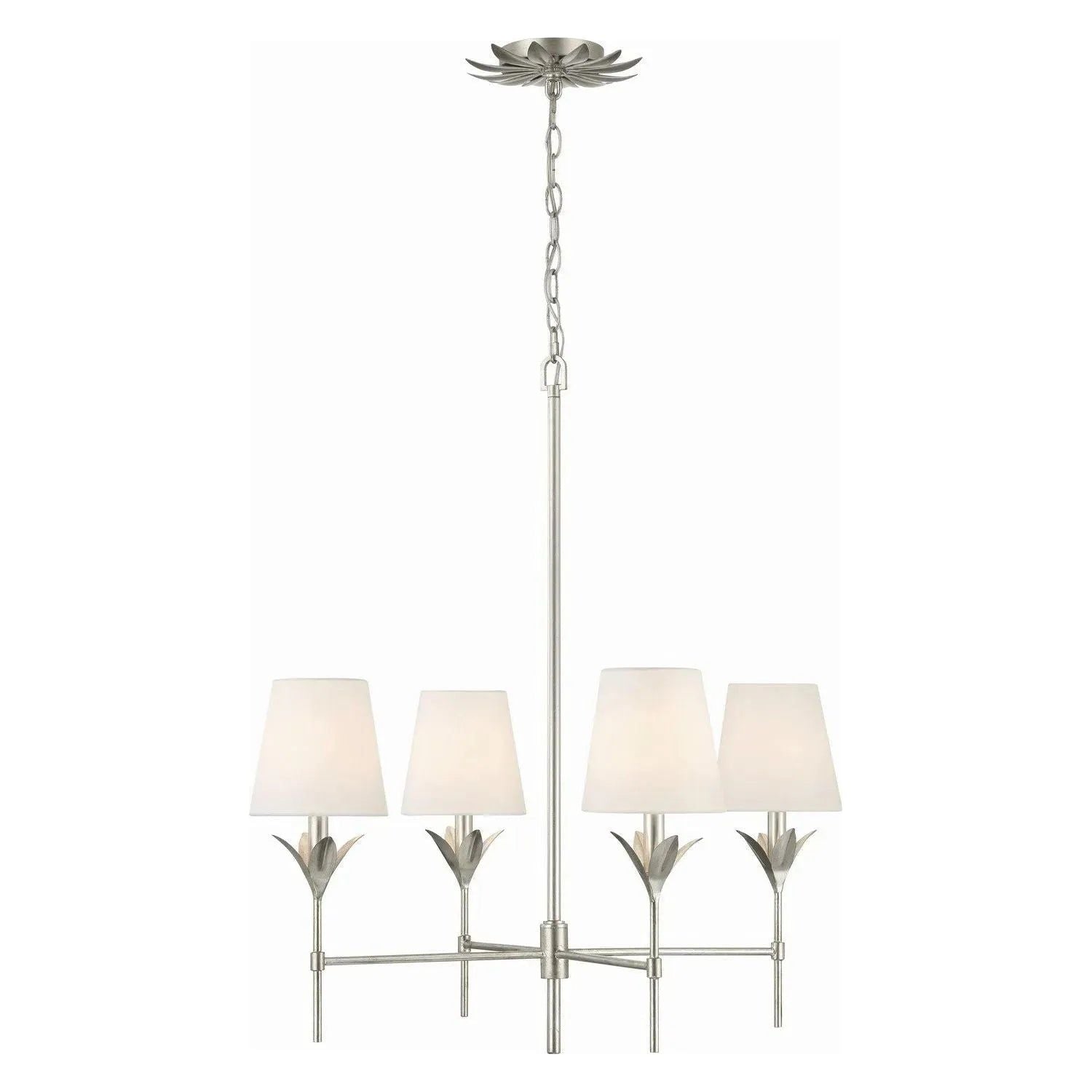 The Broche 4 Light Chandelier embodies a harmonious blend of traditional and modern elements. This fixture exudes timeless elegance with its candelabra-style frame and white linen shades. The layered wrought iron leaves create a stunning and functional display of light. Whether in a bedroom, living area, or kitchen, this chandelier adds a touch of refined glamour to any space, making it perfect for transitional and modern designs.