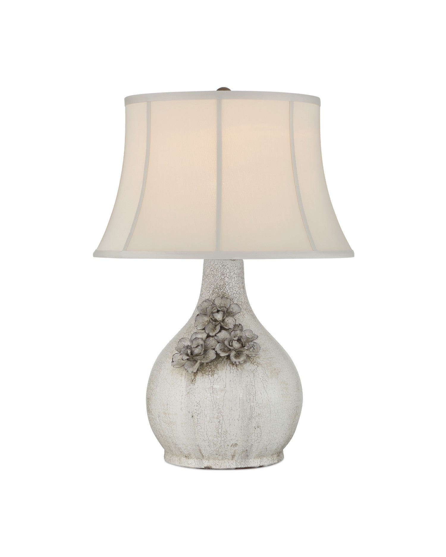 The Attar White Table Lamp is crafted from ceramic with a crackled, falling glaze that gives each piece a unique, aged character. The textured finish is especially pronounced on the trio of hand-formed flowers applied to the lamp's body, adding dimension and artisanal detail. A soft-backed, bell-shaped shade completes the design, enhancing the vintage-inspired look with a gentle, traditional silhouette.