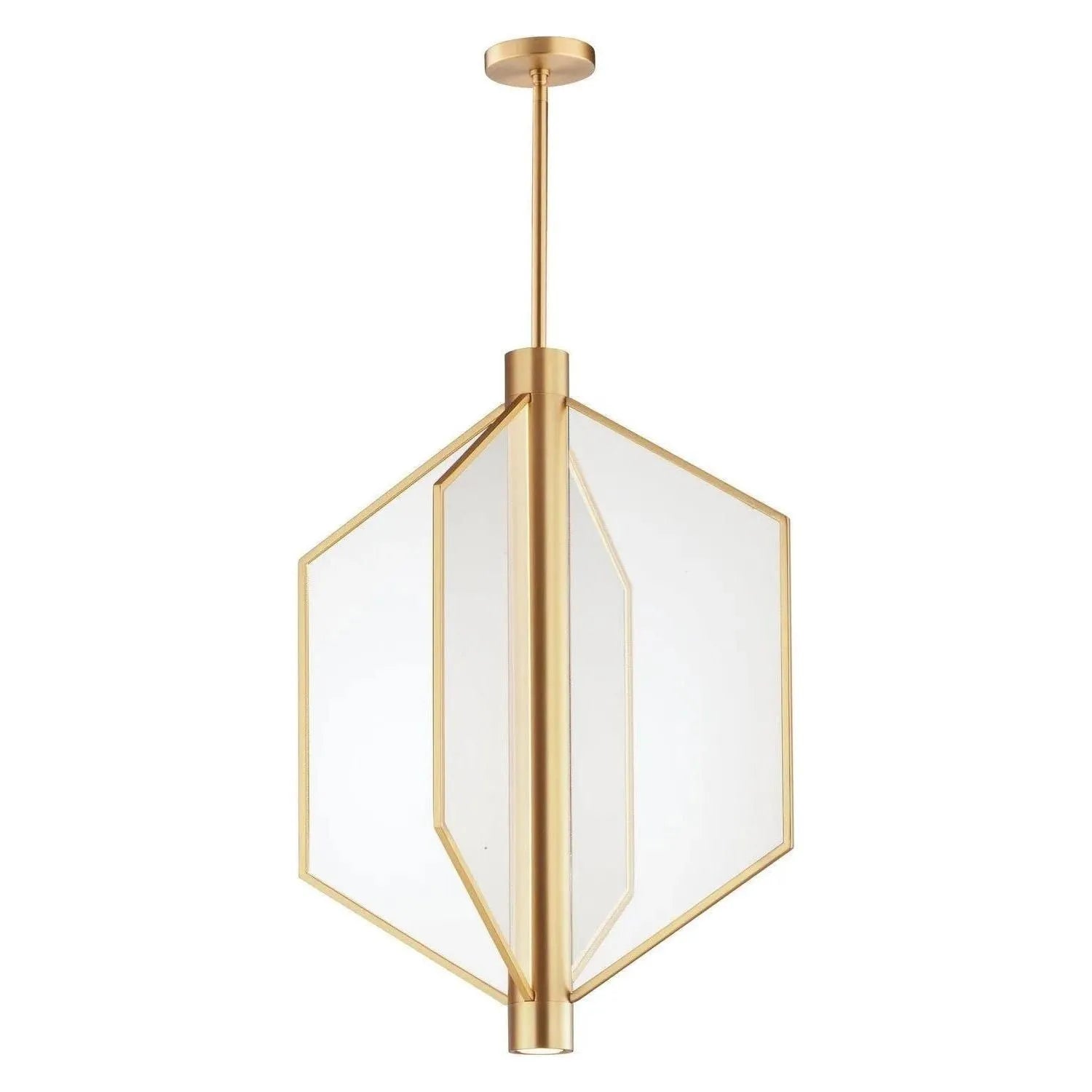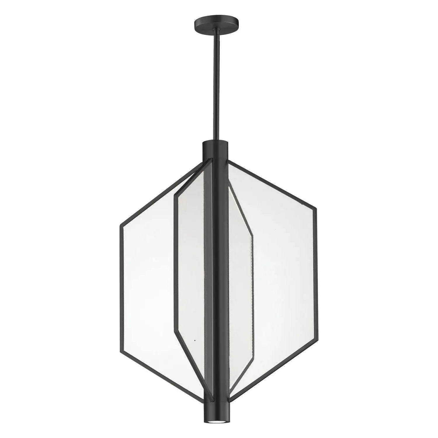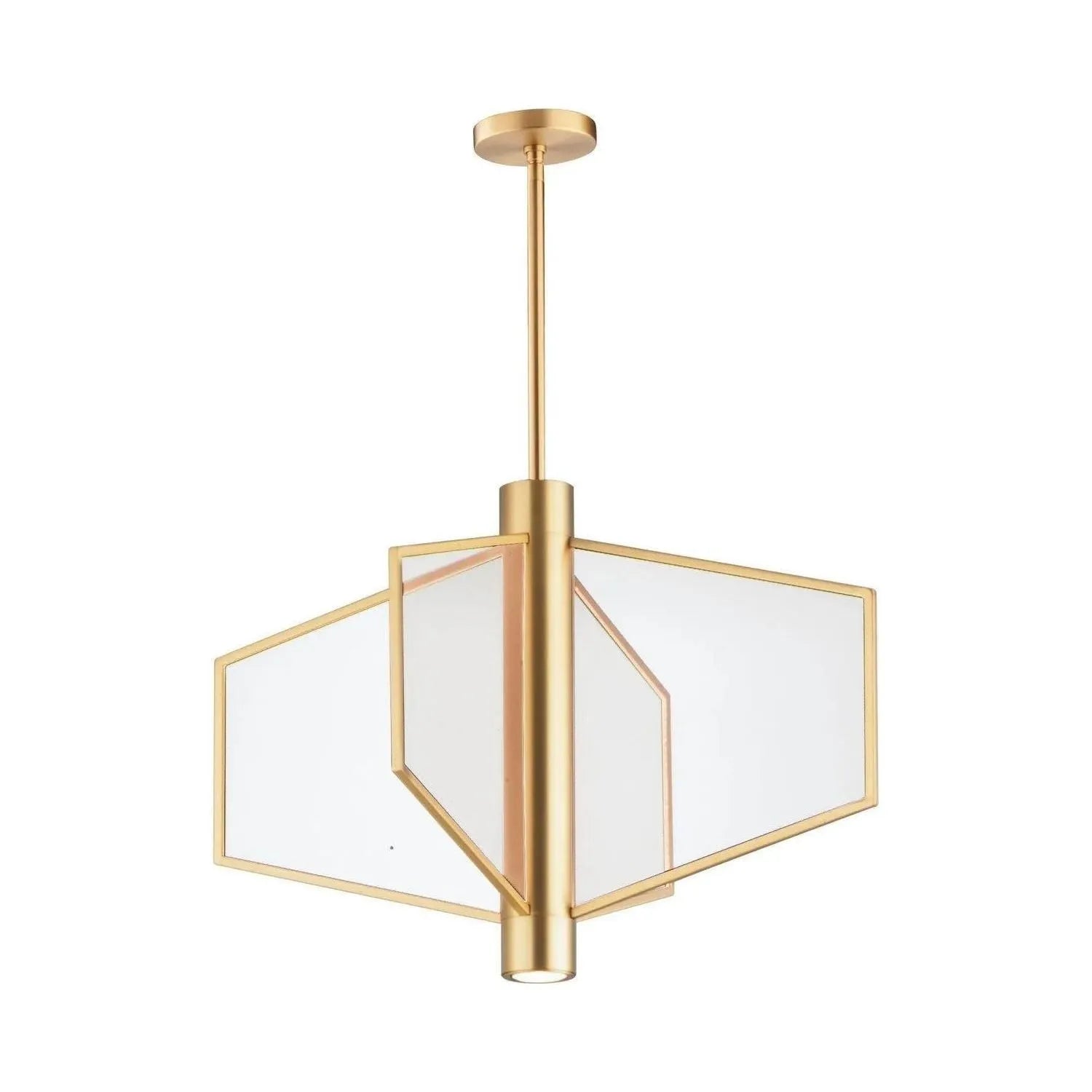Translucent acrylic panels dotted to guide indirect LED strips integrated into the body of the fixture. The angular forms of the pendants create a strikingly modern display of light that is both airy and voluminous. An additional LED GU10 bulb is recessed at the bottom of the fixture for additional functional light. Available in Satin Brass or Matte Black finishes.