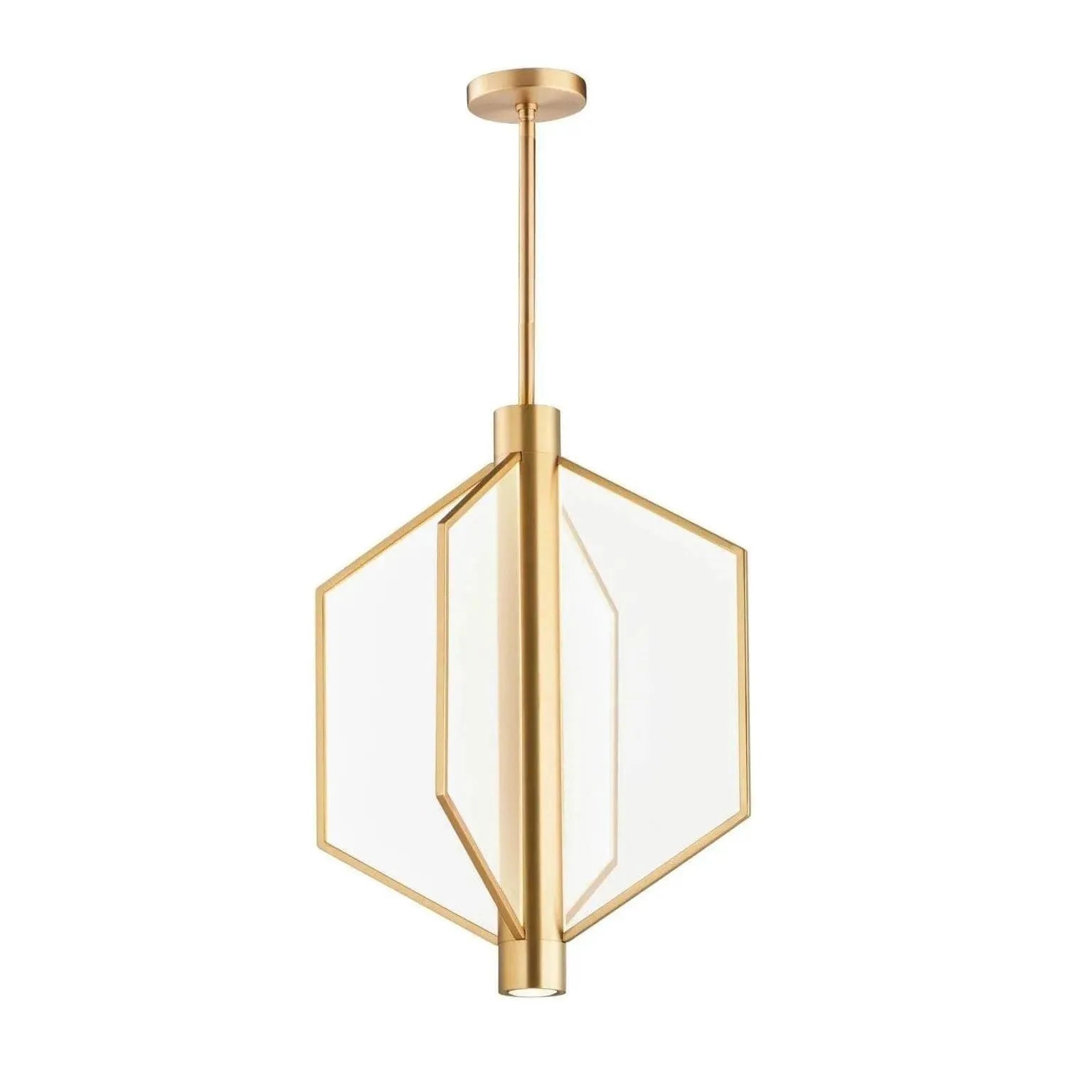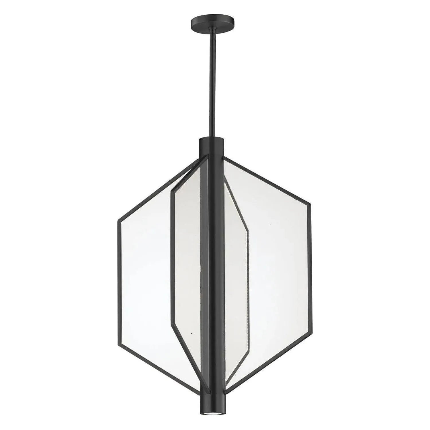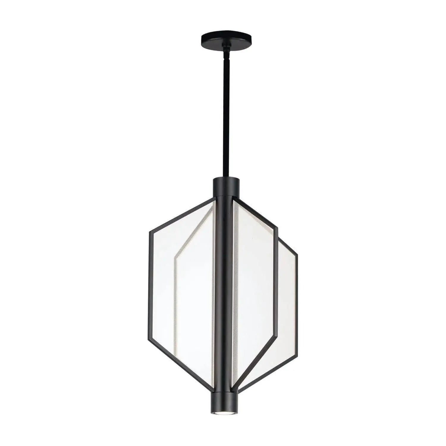 Translucent acrylic panels dotted to guide indirect LED strips integrated into the body of the fixture. The angular forms of the pendants create a strikingly modern display of light that is both airy and voluminous. An additional LED GU10 bulb is recessed at the bottom of the fixture for additional functional light. Available in Satin Brass or Matte Black finishes.