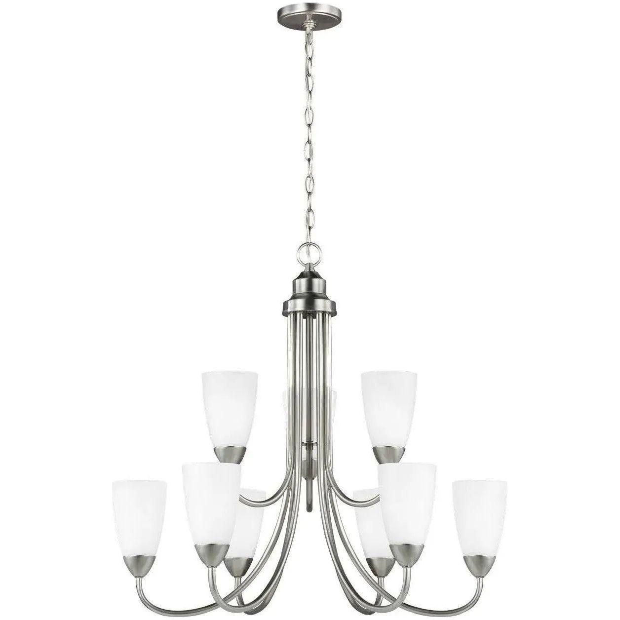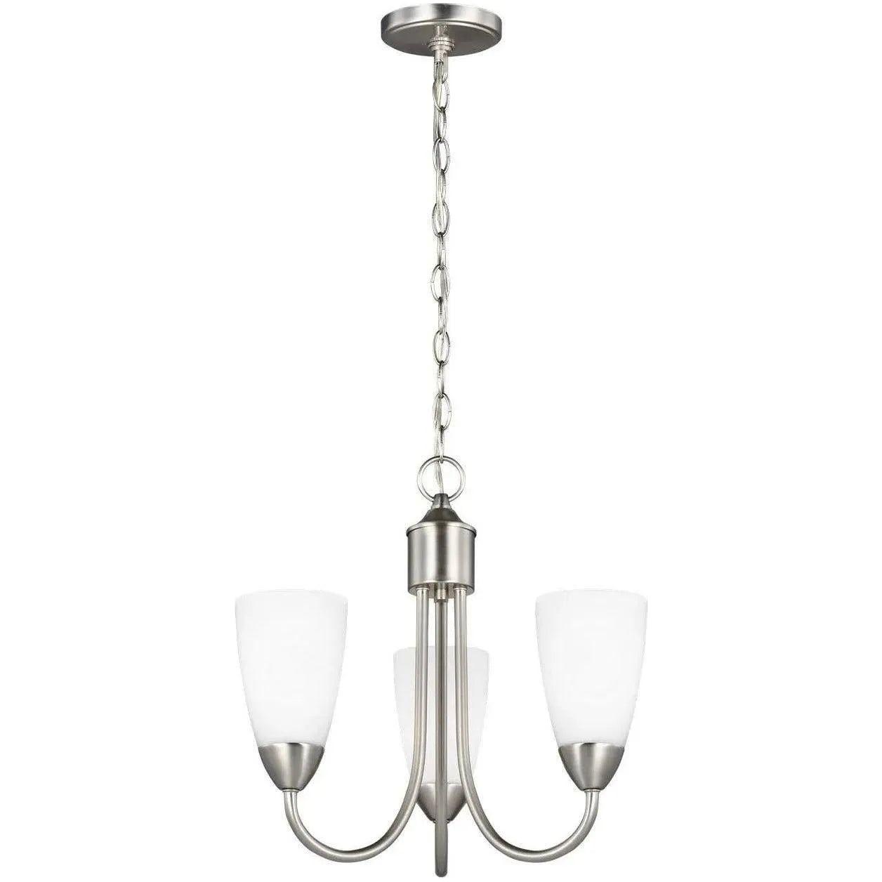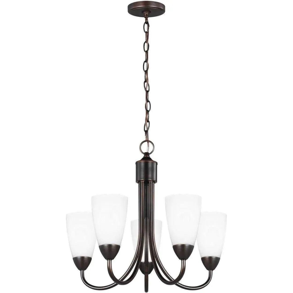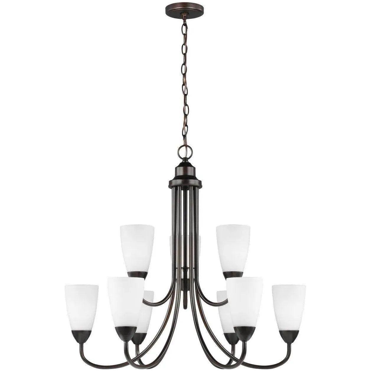The Sea Gull Collection three light single tier chandelier in burnt sienna is the perfect way to achieve your desired fashion or functional needs in your home. The Collection represents commitment to high style at a sharp price. The modernist design is epitomized by the teardrop curves in the arms tipped by etched glass diffusors throughout the chandeliers and bath fixtures. The collection offers a ''whole home'' lighting solution in every imaginable category. The assortment includes nine-light, five-light, and three-light chandeliers (either with up-light or down-light), pendants in four sizes as well as one-light, two-light, three-light , four-light and five-light wall/bath fixtures. Install a stylish and elegant addition to any room in the house. Collection is offered in Brushed Nickel and Burnt Sienna finishes.
