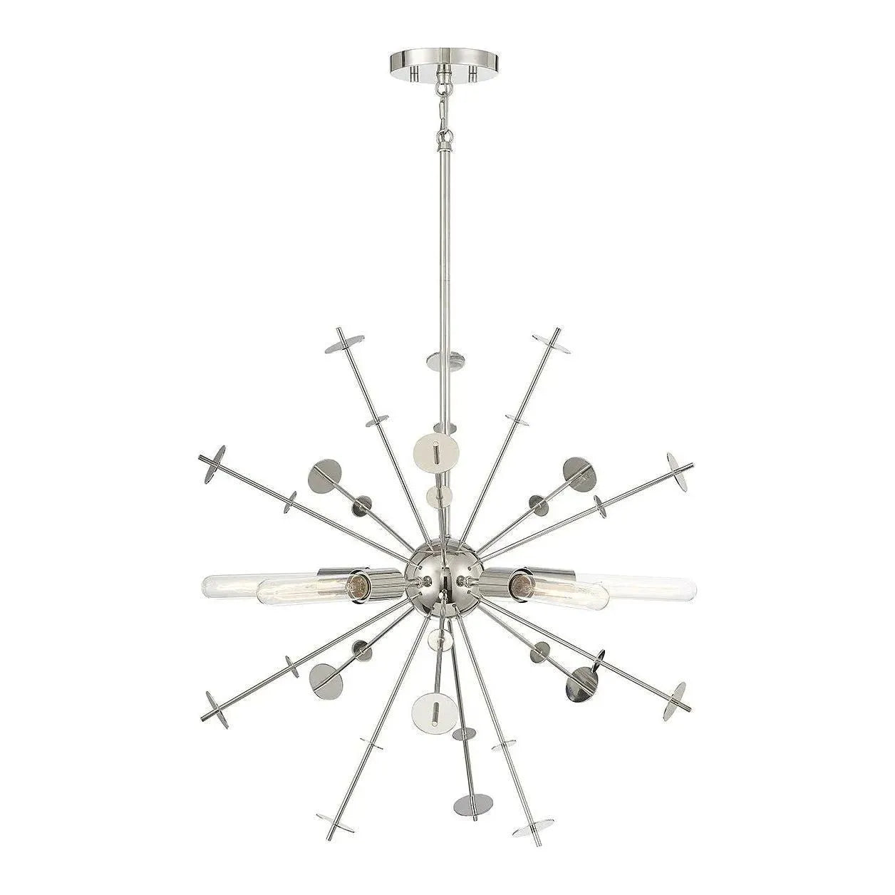 Meridian Pendant by Meridian Lite Trends makes a confident design statement — a modern sputnik silhouette rendered in precision metalwork to anchor elevated interiors. The sculptural form pairs slender radiating rods with deliberately placed disc accents, producing a balanced, geometric profile that reads contemporary yet timeless.