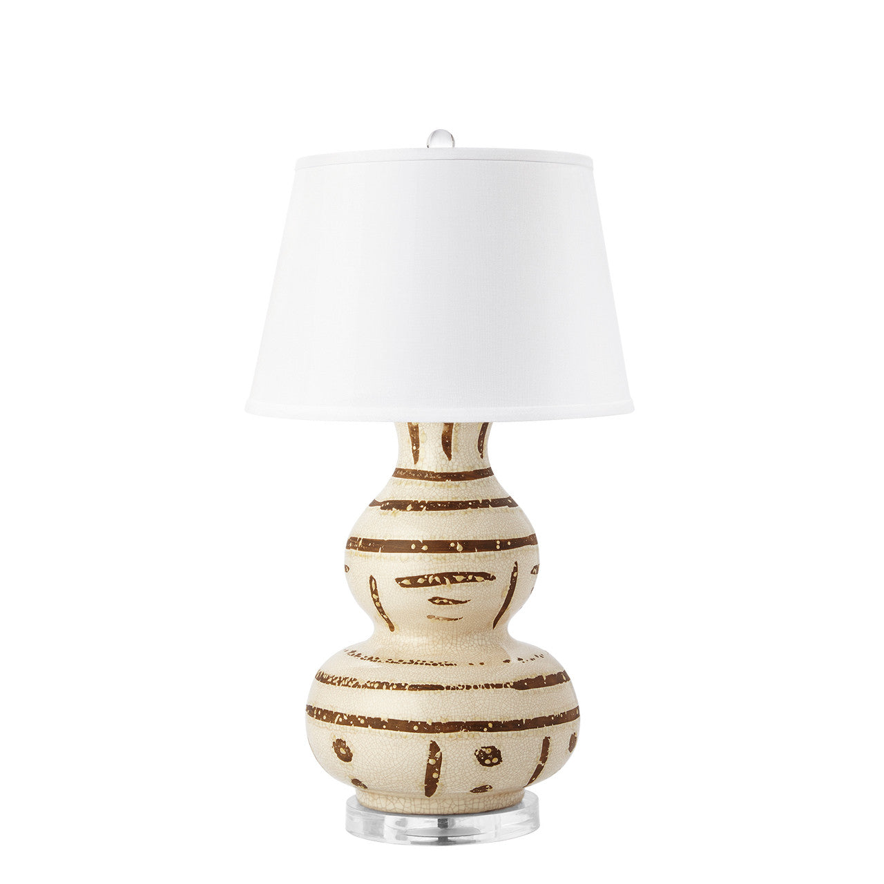 For the Shino Lamp, Villa & House’s artisans have tapped global artwork to create a modern artifact with museum-worthy appeal. The shapely curves of the double-gourd design feel at once organic and distinctly handcrafted, nodding to the traditional forms of centuries-old pottery. The ceramic body features hand painted strokes of burnt umber, whose imperfect lines and aged effect recall the look of an ancient tribal pattern. The Shino’s sense of antiquity is made even more distinct with its all-over craquelure finish in glazed ivory. Its earthy tones and aged aesthetic find interesting contrast in its clear acrylic base, giving it the look of a rare and priceless relic on display in a gallery or collection. Its contemporary craftsmanship and functional appeal, however, keep it firmly rooted in the present. Topped with one of our signature shades, this lamp is a striking pick for the chic bohemian or sophisticated world traveler. Please note: Villa & House's lamp shades are sold separately. For the Shino Lamp, Villa & House’s artisans have tapped global artwork to create a modern artifact with museum-worthy appeal. The shapely curves of the double-gourd design feel at once organic and distinctly handcrafted, nodding to the traditional forms of centuries-old pottery. The ceramic body features hand painted strokes of burnt umber, whose imperfect lines and aged effect recall the look of an ancient tribal pattern. The Shino’s sense of antiquity is made even more distinct with its all-over craquelure finish in glazed ivory. Its earthy tones and aged aesthetic find interesting contrast in its clear acrylic base, giving it the look of a rare and priceless relic on display in a gallery or collection. Its contemporary craftsmanship and functional appeal, however, keep it firmly rooted in the present. Topped with one of our signature shades, this lamp is a striking pick for the chic bohemian or sophisticated world traveler. This lamp is topped with a crisp white laminated linen shade, accented with nickel hardware.