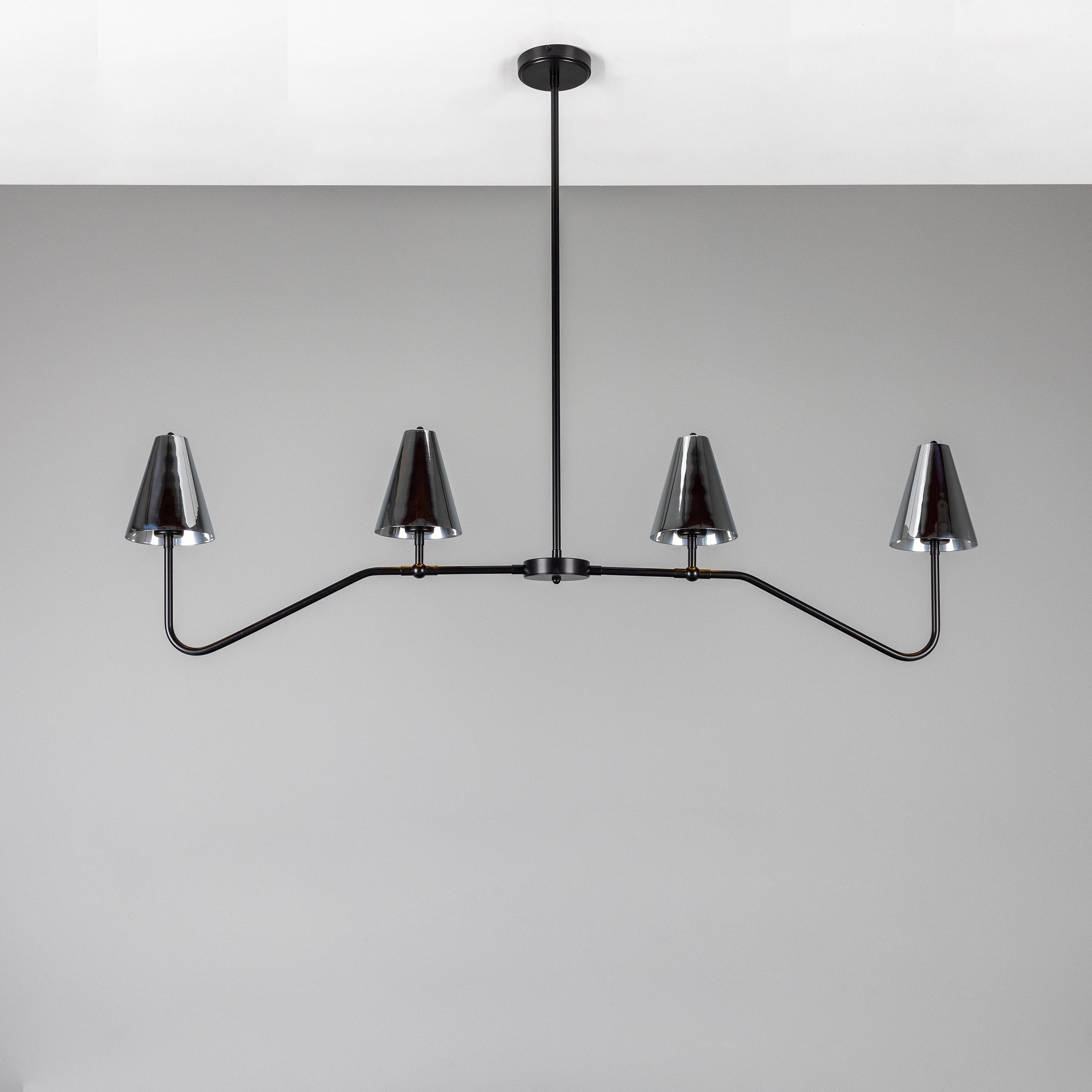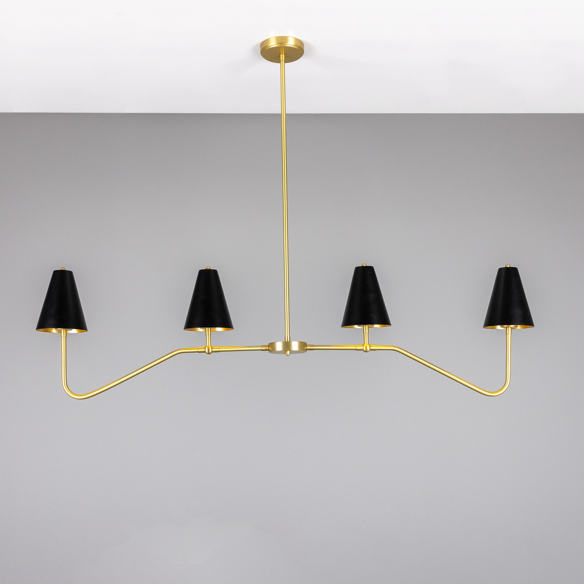 Salvador Chandelier — a linear study in proportion and restraint, crafted to deliver refined, directional light over dining islands and long tables. The silhouette pairs slim brass tubing with conical shades to create a modern architectural presence that reads equally at home in minimalist, transitional, or mid-century interiors.