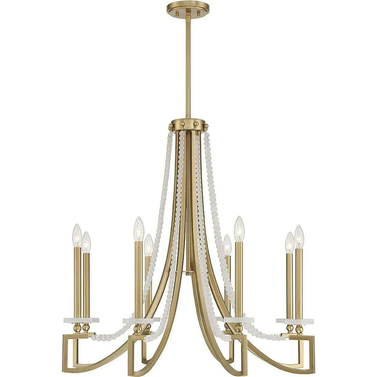 Featuring elegant strands of frosted beads and matching frosted bobeches, the Savoy House Helen 5-light chandelier adds a touch of classy style to the home. Warm brass finish. Helen is 26.25" in height and 27" in width. It uses 5 candelabra bulbs with a max of 60 watts per bulb (bulbs not included).