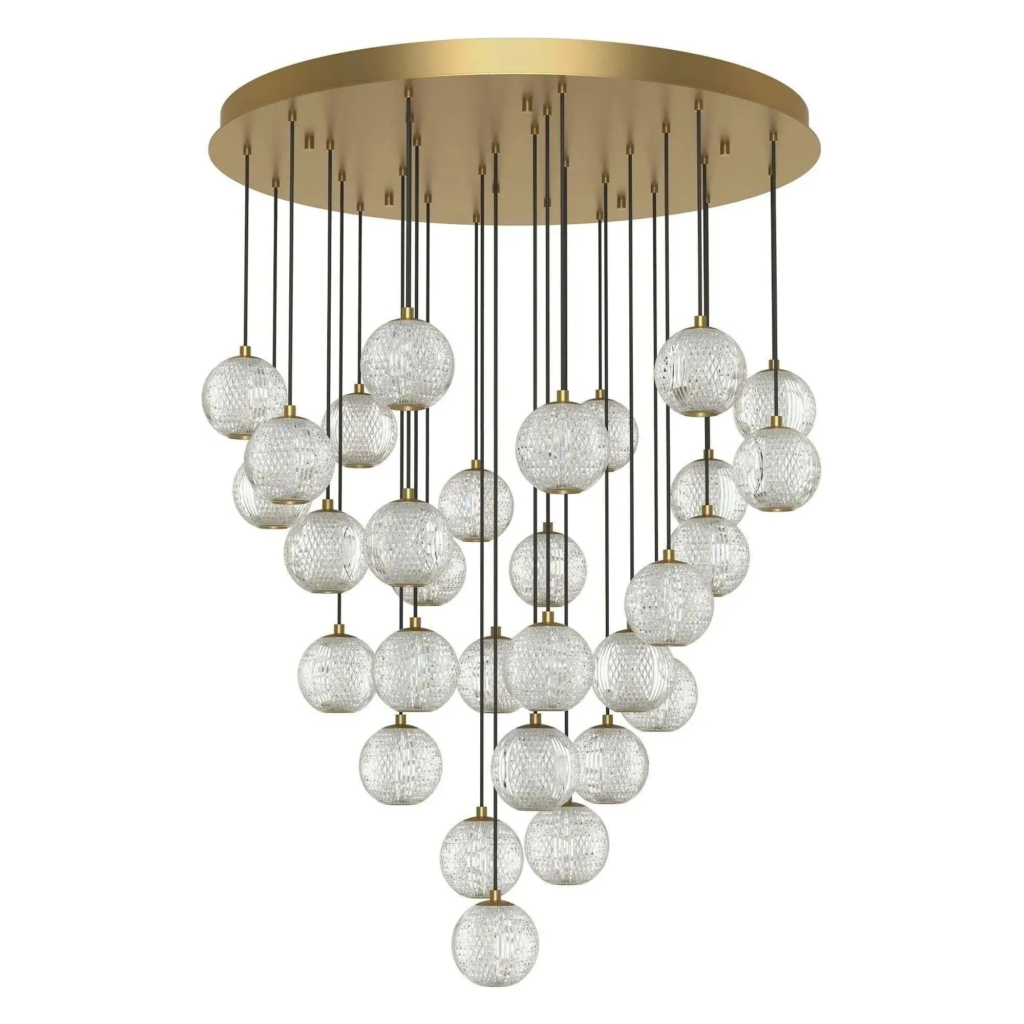 Like a gorgeously beaded garment, the Marni collection add luxury and interest to any design. Meticulously cut spherical shades create glittering beams of illumination throughout the design. Available in Polished Nickel and Natural Brass accompaniments.