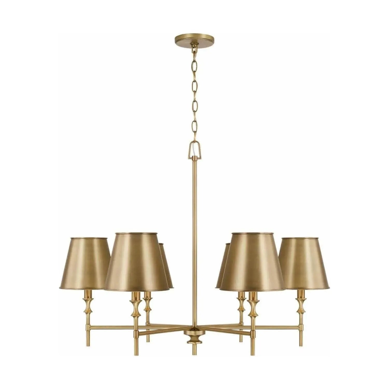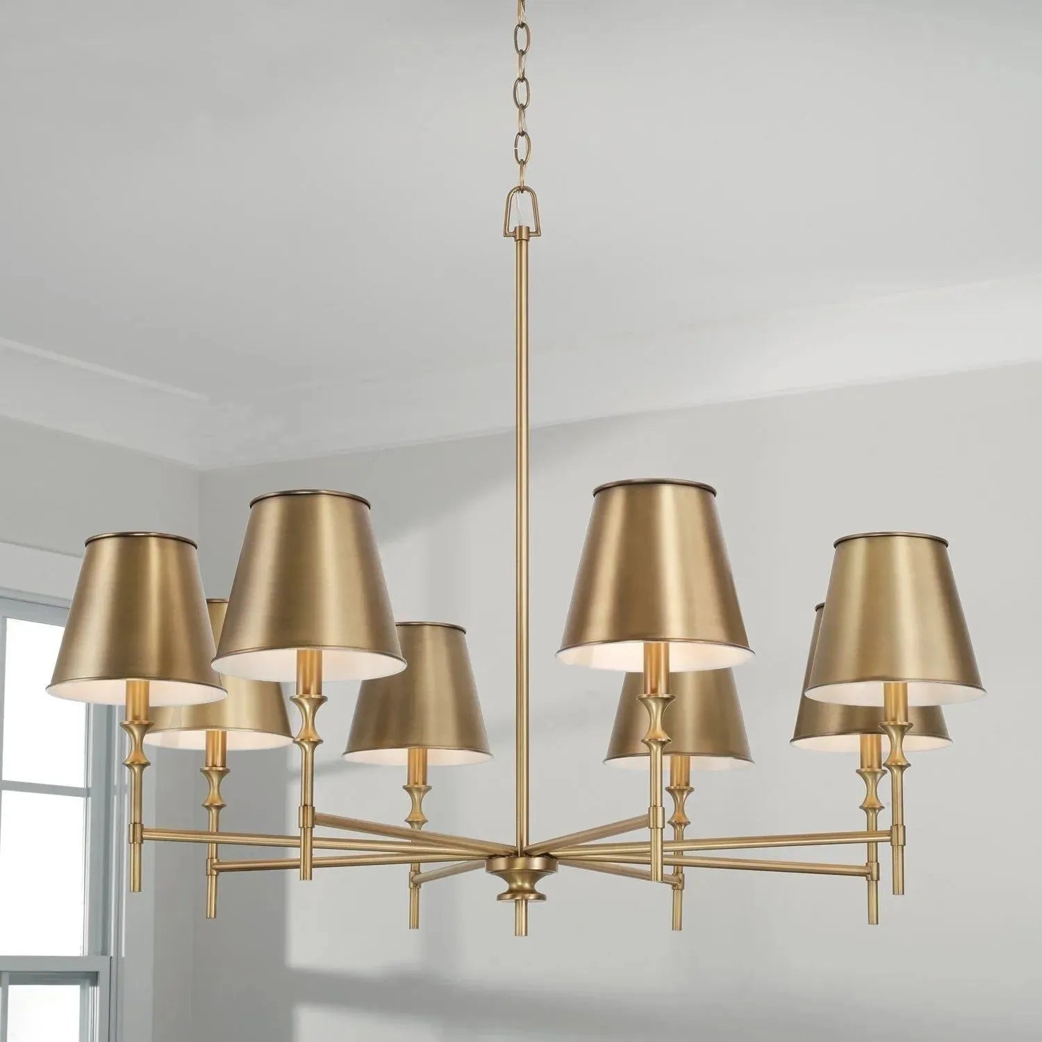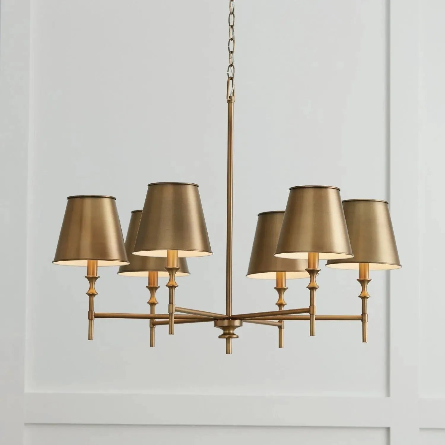 The standout feature is its Aged Brass metal shades with a white interior that radiates a soft, inviting glow. The contrast between the warm metallic finish and the bright interior yields a modern look while honoring traditional design roots. Designer details add intrigue, elevating the fixture from lighting to art.