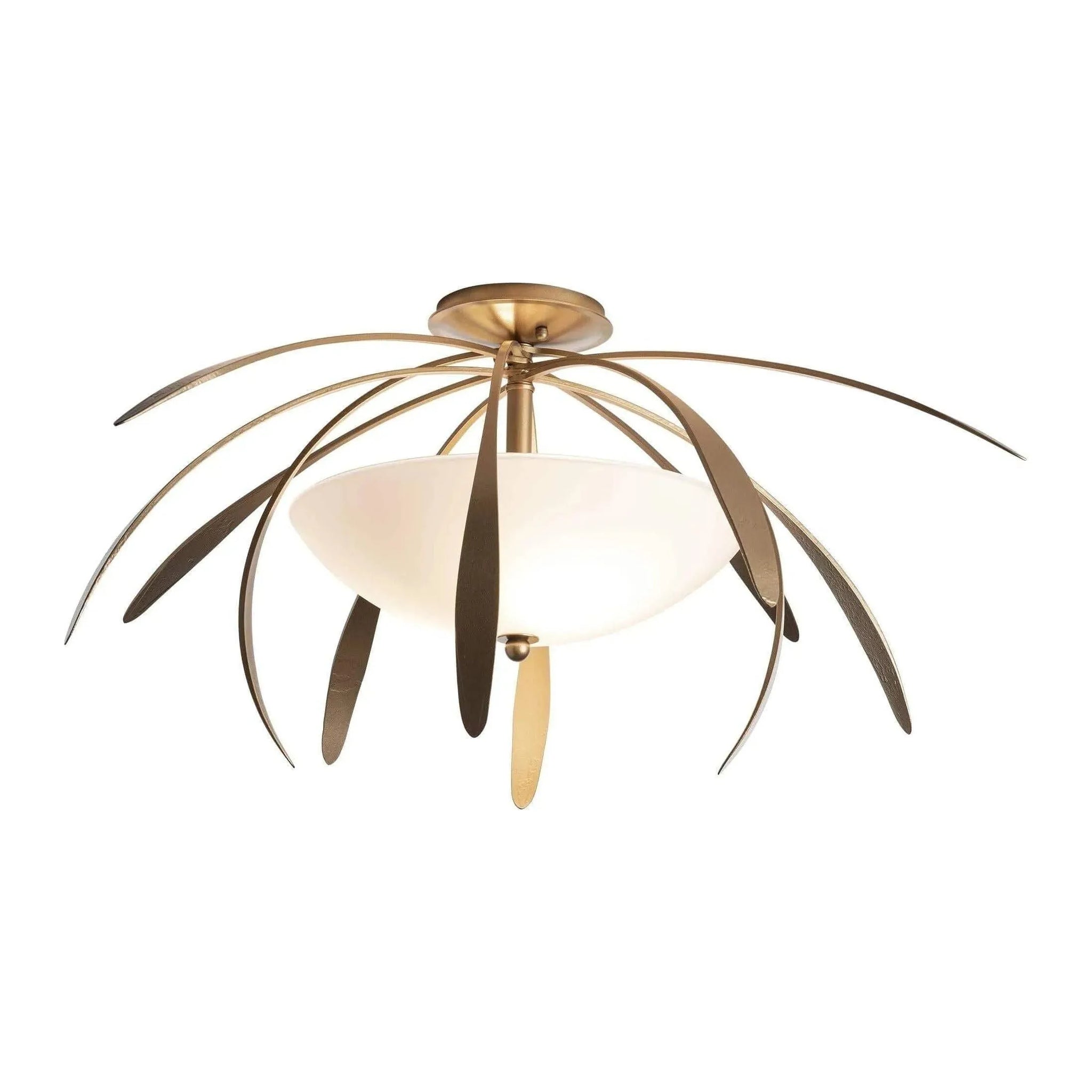 Large semi-flush ceiling light with forged steel petals and a glass bowl shade.