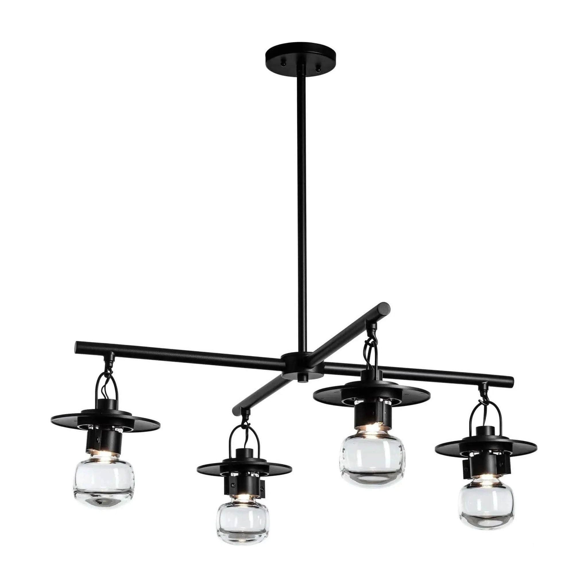 Four light outdoor living pendant light. Features a multi-height stem kit featuring two 12" stems, one 6" stem and one 3" stem which may be combined interchangeably to customize the overall height.