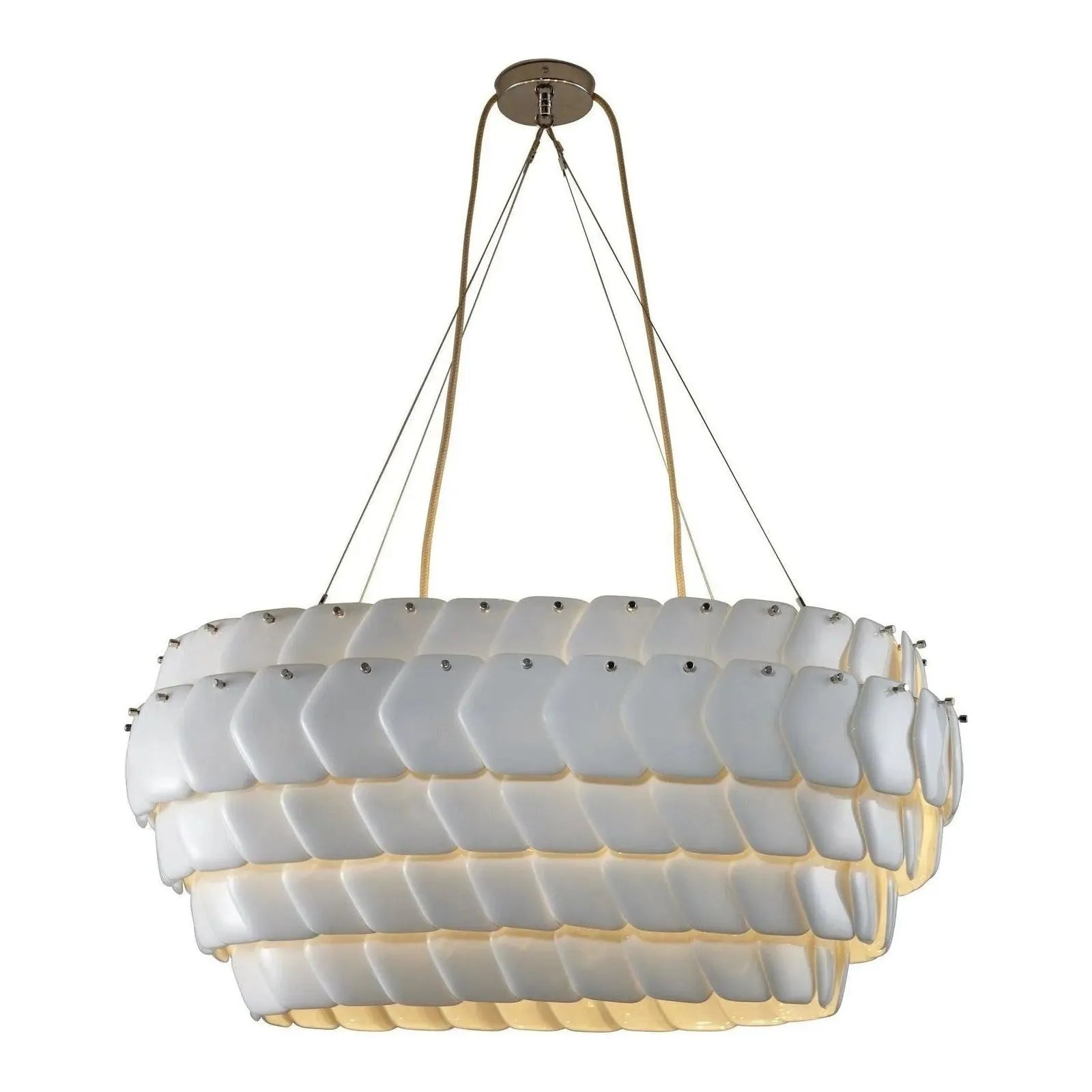 The Cranton Pendant is a magnificent statement piece, perfectly suited for hallways, bedrooms and sitting rooms. Eye-catching both when lit or unlit, there are two styles-the wider shaped Cranton Oval pendant and the deeper based Cranton Hexagonal pendant. Each version is made up of multiple, overlapping hexagon shaped bone china discs, which when lit, produce a warm, ambient light with striking forms and shadows.