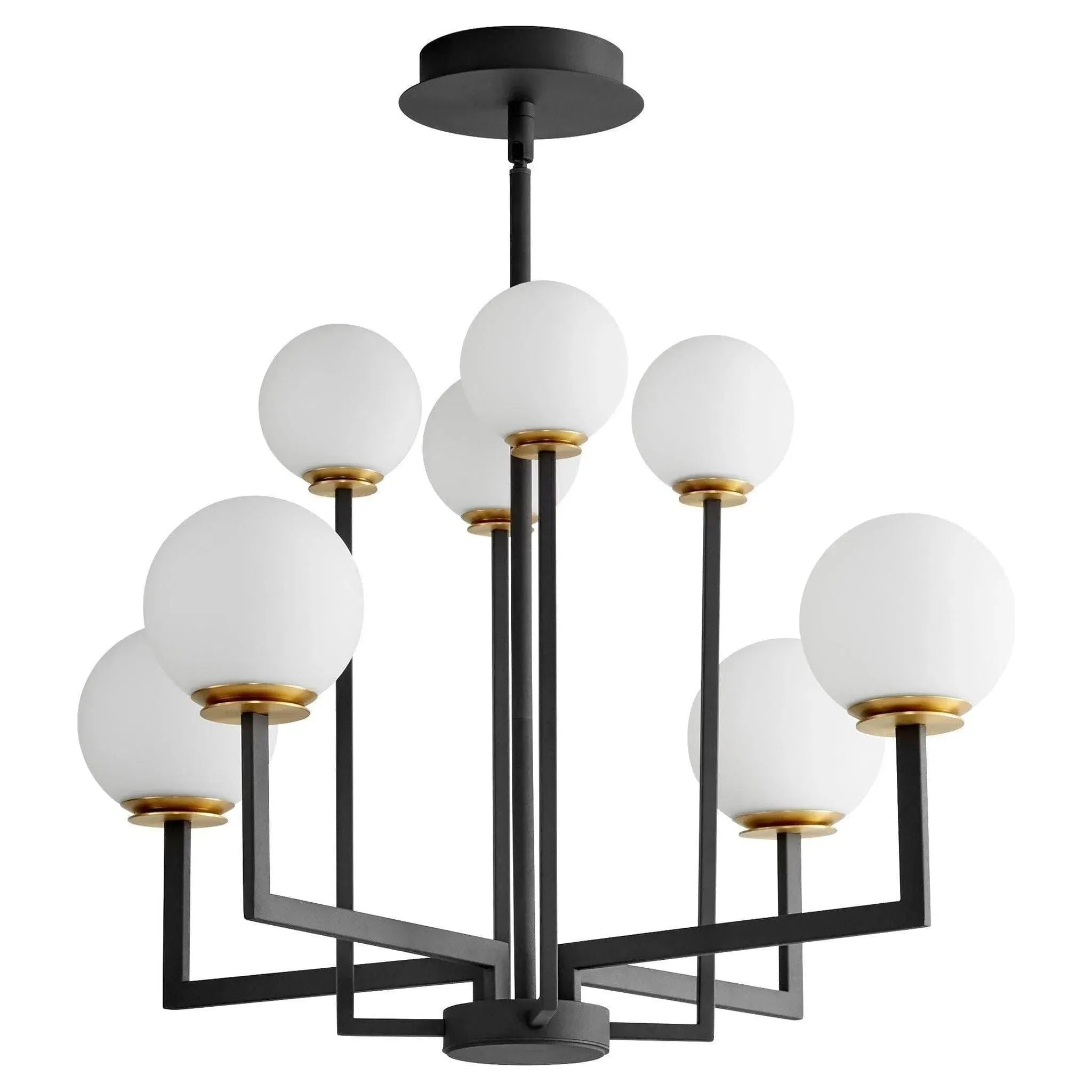 Bonzo LED Chandelier by Oxygen Lighting merges sculptural form with practical illumination — a modern centerpiece designed for curated interiors. Clean, angular black metal arms rise from a central stem to support eight opal glass globes, each detailed with a subtle brass collar for a warm, refined contrast.