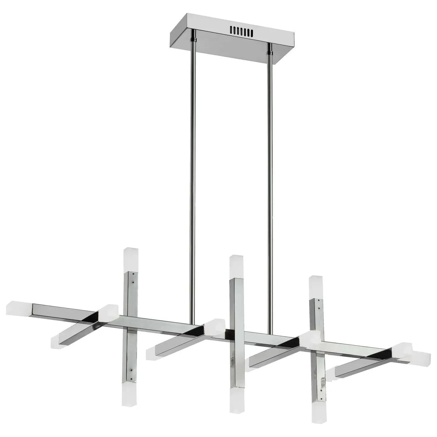 Acasia LED Chandelier by Dainolite — a sculptural, modern lighting statement that balances architectural form with warm, efficient illumination. Linear brass-finish arms intersect in a refined grid, each end capped with frosted diffusers to deliver even, glare-free light ideal for elevated interiors.
