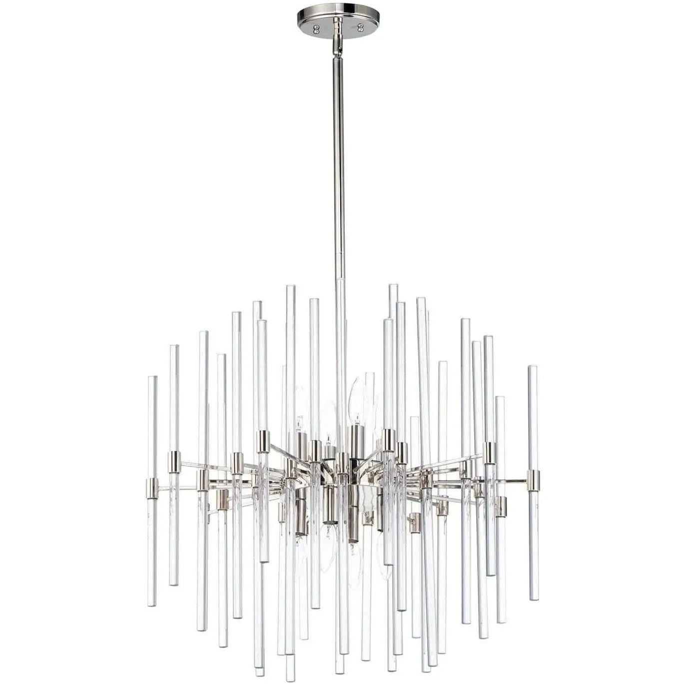 The composition of Clear glass rods are elegantly supported by thin radial arms of staggered lengths to create an iridescent motif that is truly Divine. Finished in Polished Nickel or Heritage Brass, the simplicity of this design delivers a crisp lighting fixture that works in a multitude of interior aesthetics from contemporary to traditional. Available in pendant, chandelier, and wall sconce configurations.