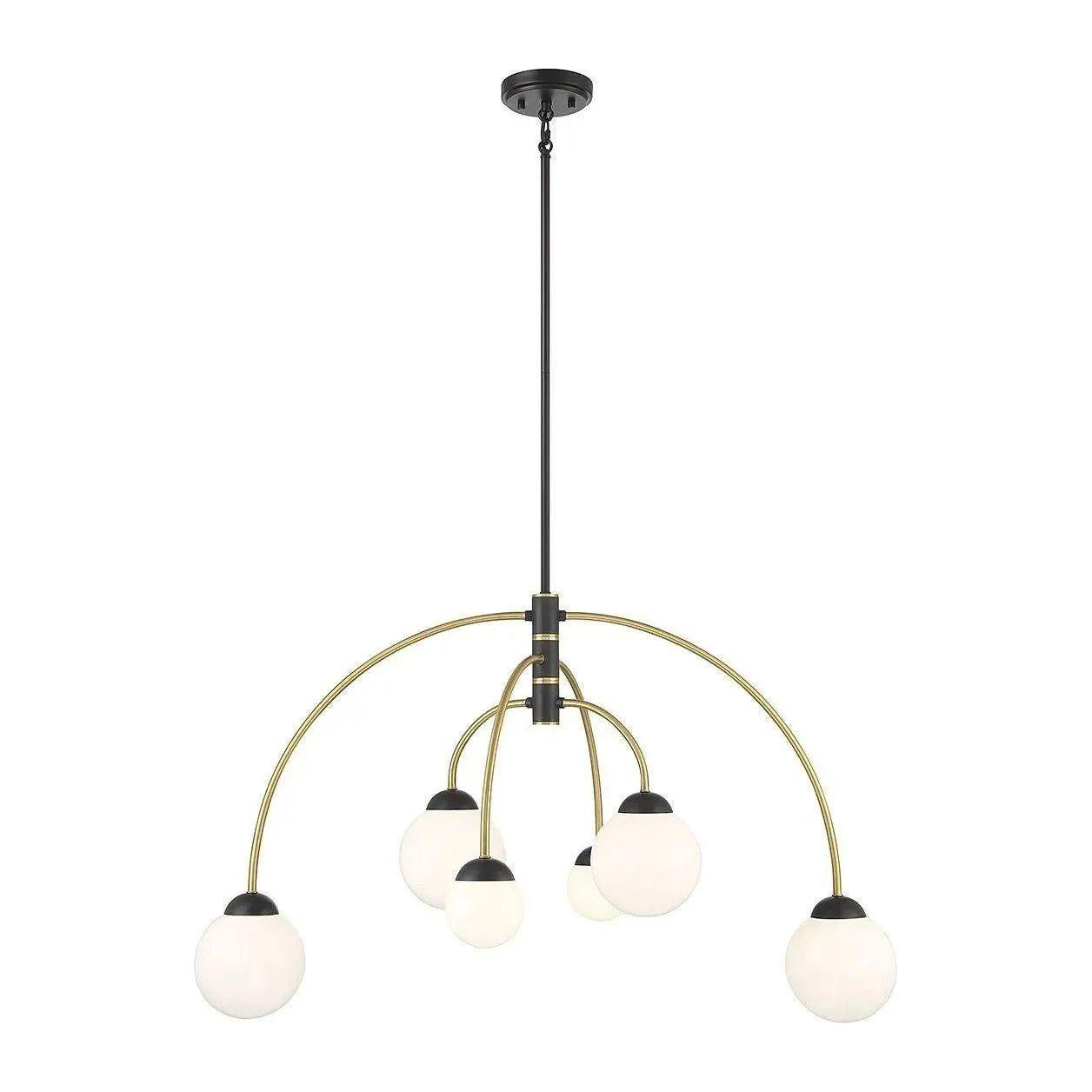 Hand-finished metal arms sweep into five perfectly round opal glass shades, anchored by a slim matte black canopy and adjustable stem for tailored ceiling heights. The interplay of warm brass-tone arcs and dark hardware delivers a refined contrast that complements modern, transitional and minimalist schemes.