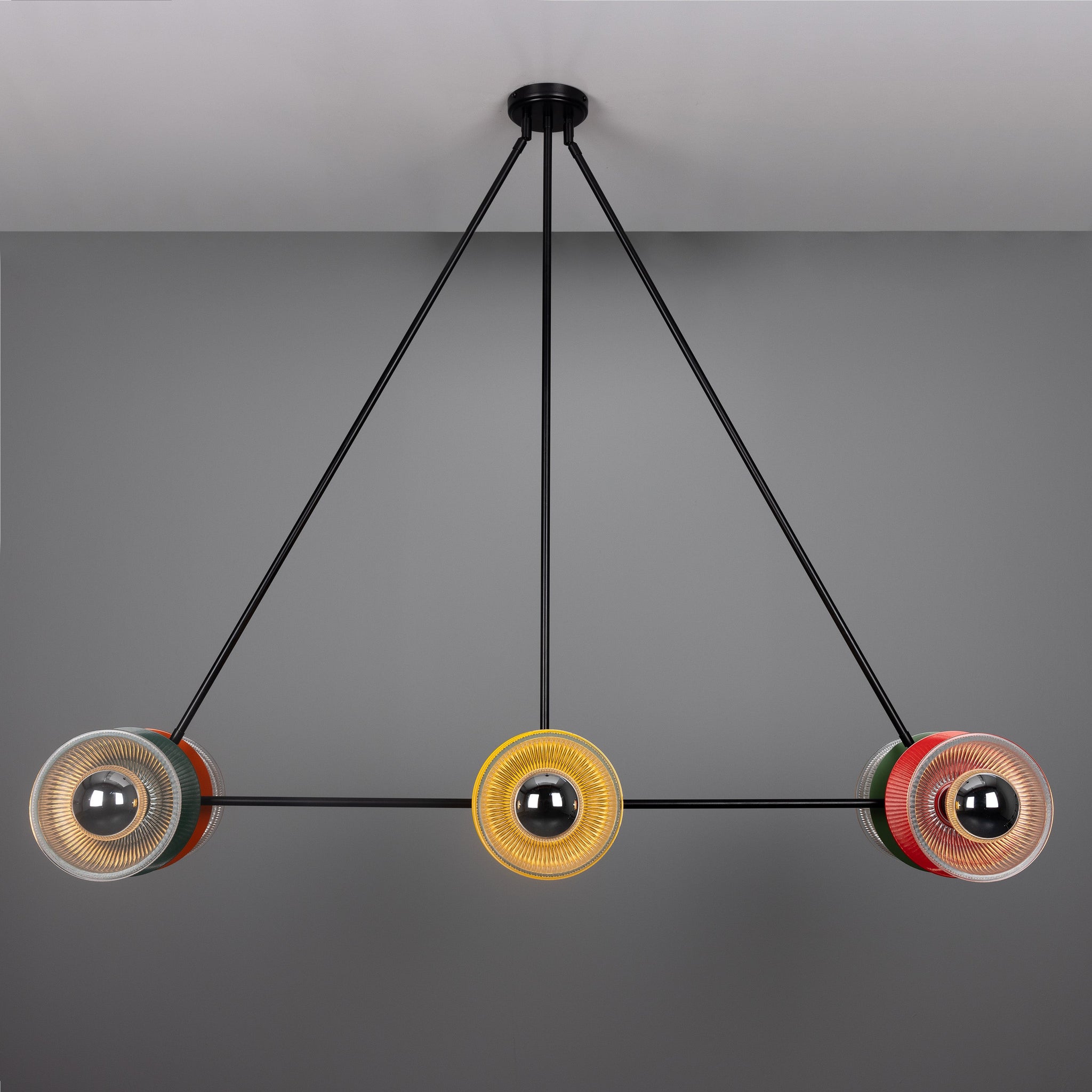 Eclipse Multicoloured Chandelier by Mullan Lighting is a sculptural statement fixture that balances refined engineering with playful color accents. Its tensioned three‑rod frame and linear arm create a precise, geometric profile while the ribbed glass lenses diffuse light into a warm, textured glow—designed to read as art from a distance and perform as quality task lighting up close.