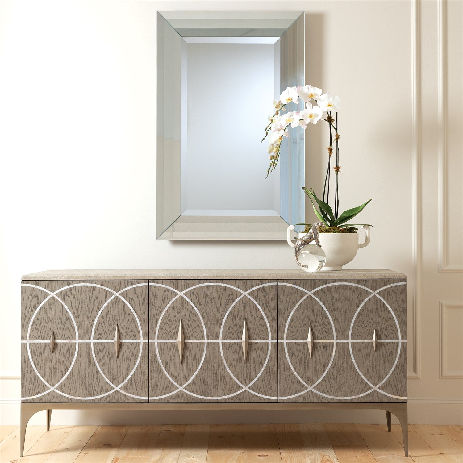 Ada's Mirror from Global Views is a considered statement piece that balances refined form and functional clarity. Italian-made with pronounced bevels, the layered glass frame creates depth and a subtle play of light—an ideal anchor for elevated interiors.