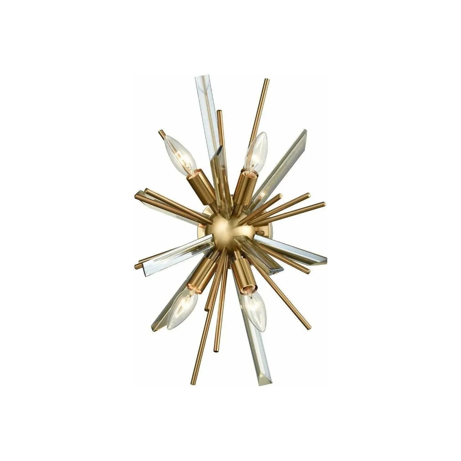 Inspired by the original sputnik design. The Palisades Ave. Collection features various size spokes attached to a central spear base. This Antique Brass all sconce is accented with a mixture of champaign glass and glowing balls.