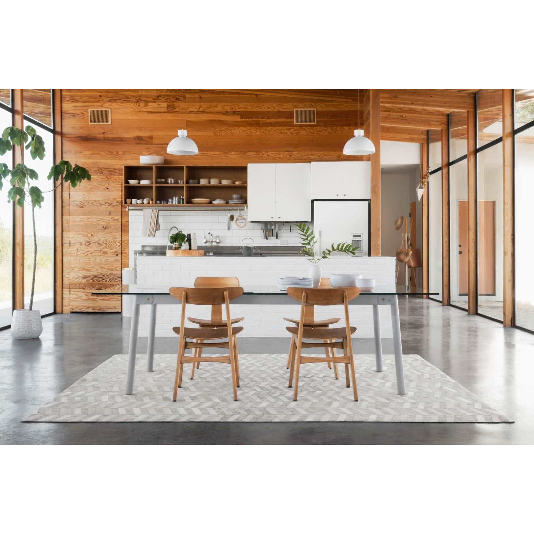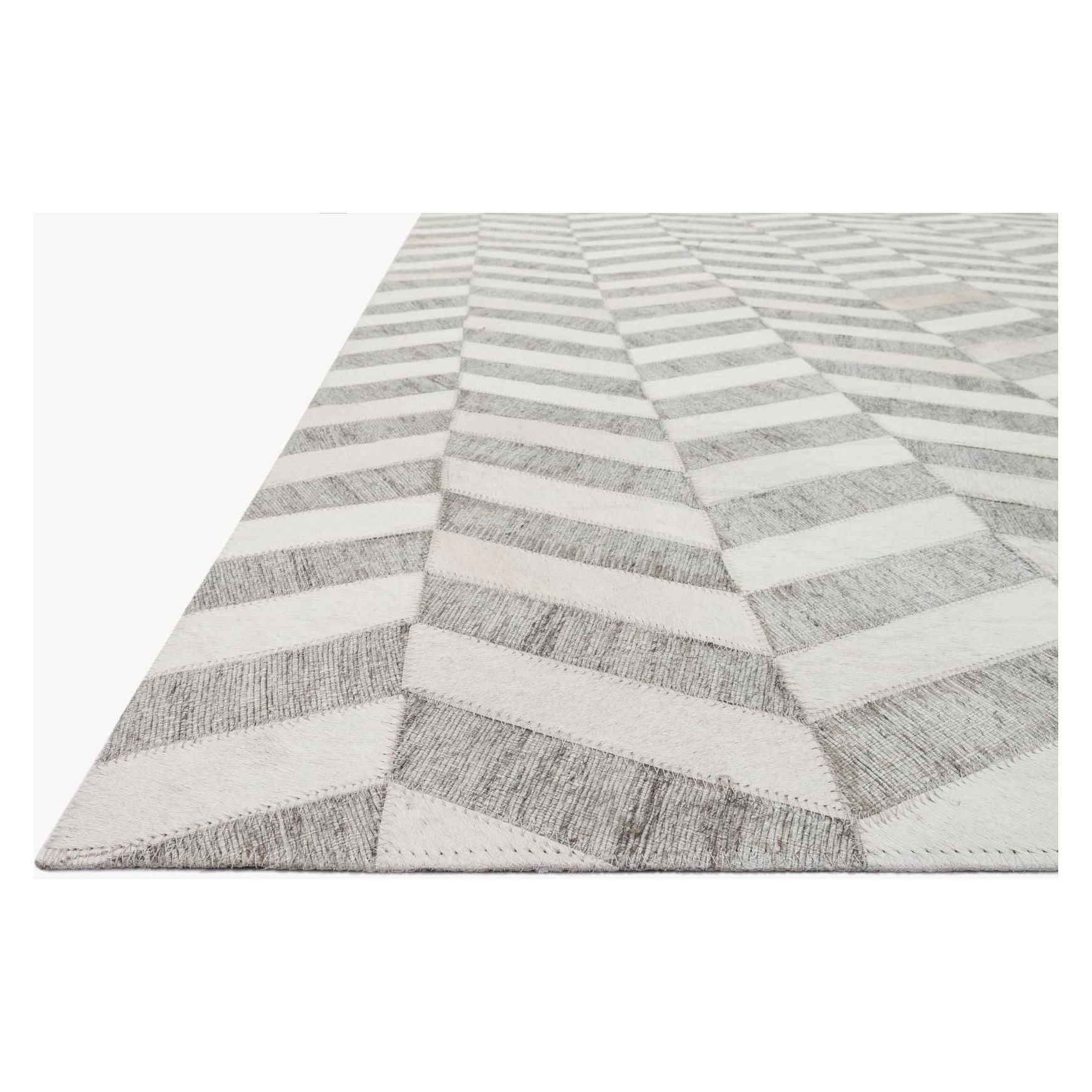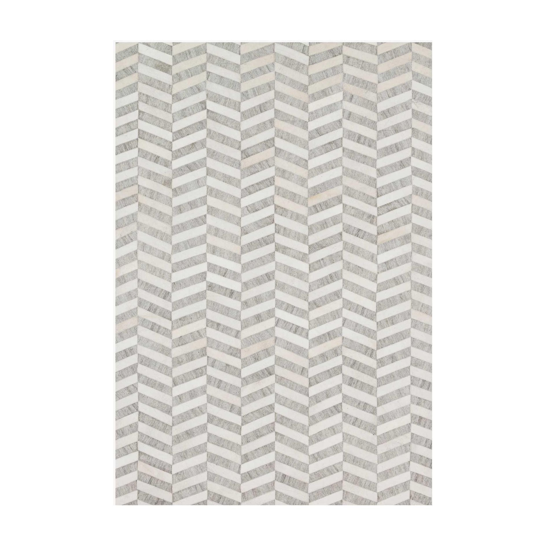 stunning Dorado DB 01 Grey Ivory rug from India. This exquisite piece blends hand-stitched authentic cowhide with hand-woven viscose, creating a unique and eye-catching design. The fusion of materials gives this rug a bold and unexpected appearance that will elevate any room in your home.