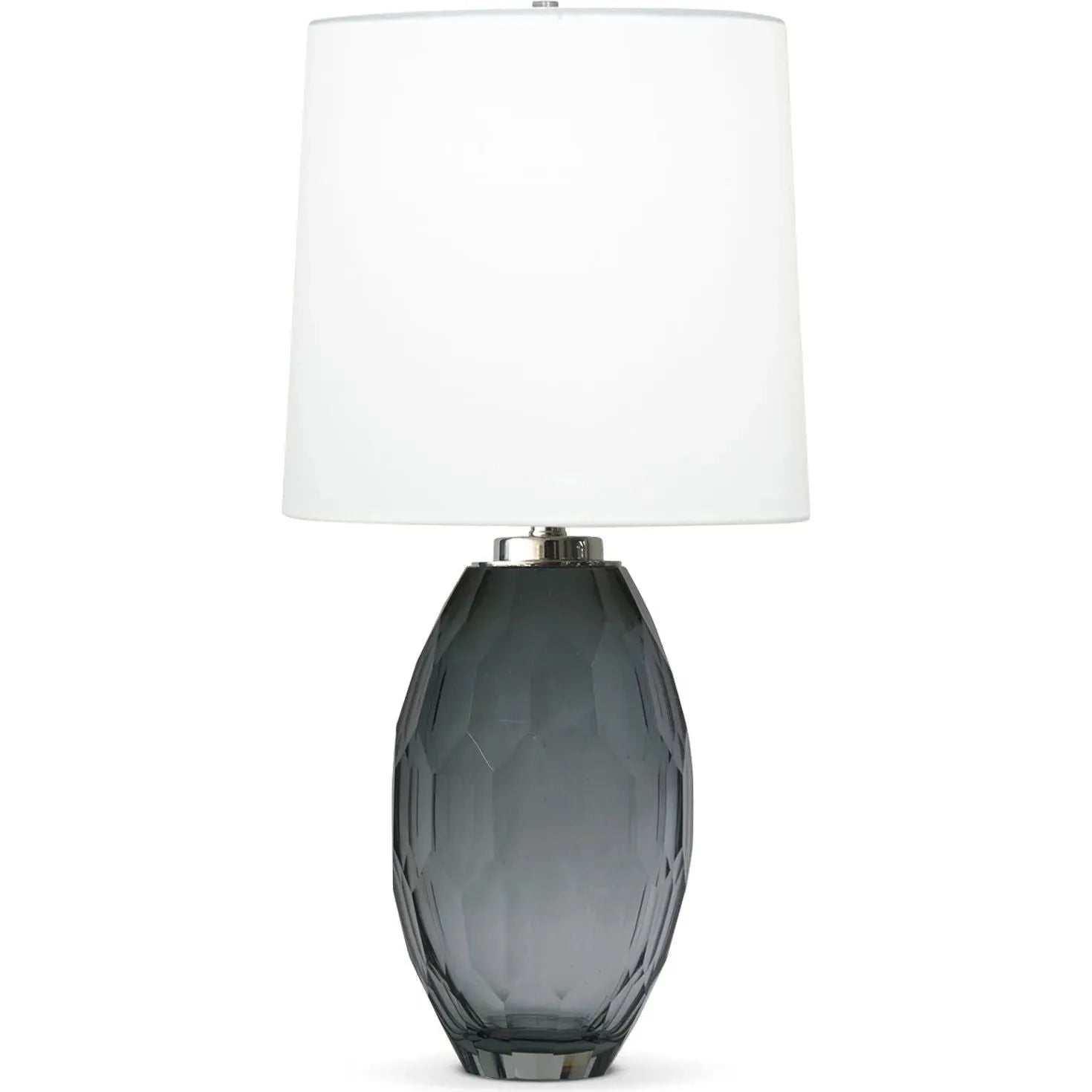 This contemporary table lamp will create an instant point of interest when in use. The tapered glass base in a smoked gray hue showcases a molded diamond quilt pattern and is finished in polished nickel. An off-white cotton shade helps the lamp truly come alive when lit. Design note: The cloth cord comes out of the socket.