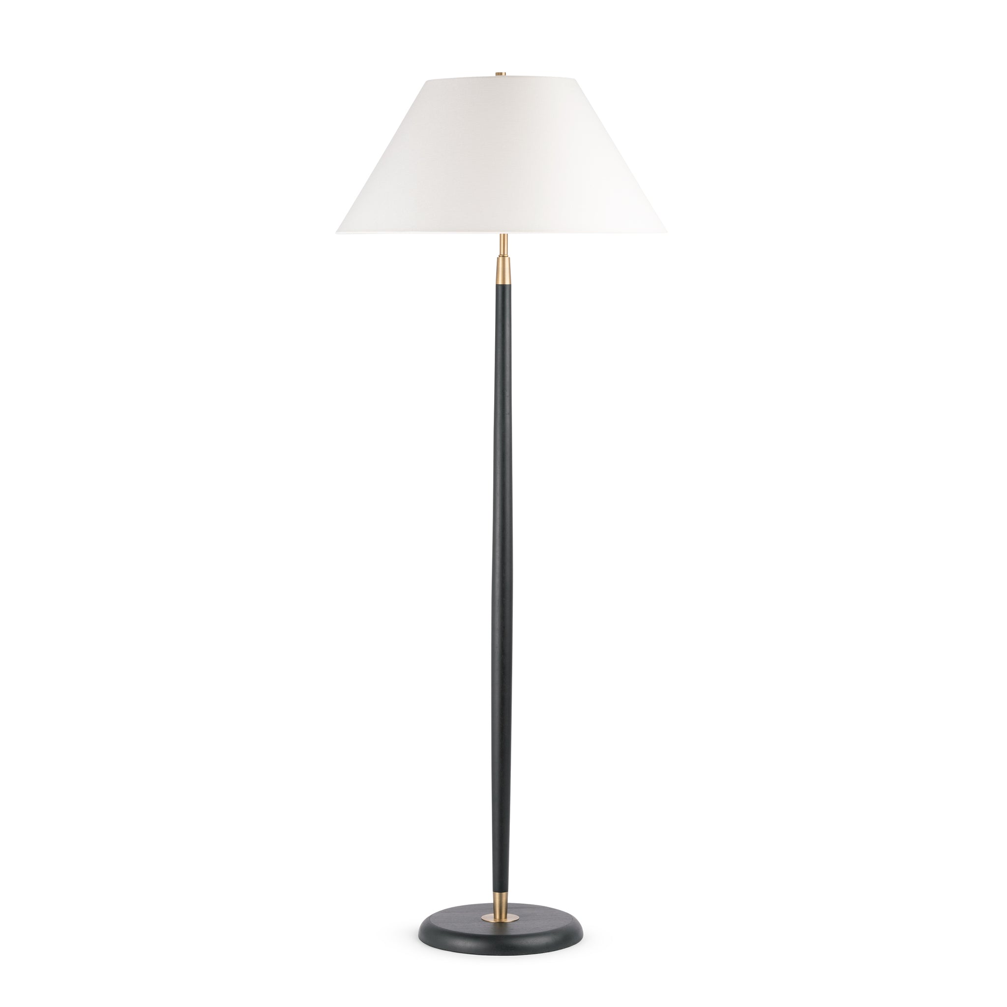 The elegant Salem Floor Lamp is built with a slender body that gently tapers outward toward the center, shaped from sturdy wood and finished in a silky black stain. Antique brass accents collar the base and the socket with a luxe gleam to suit glamorous environments. The tapered drum shade cuts a dramatic modern silhouette.