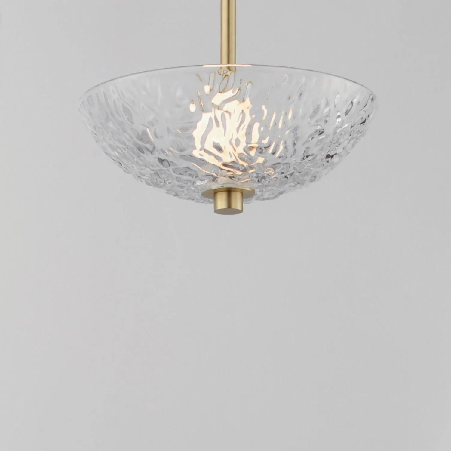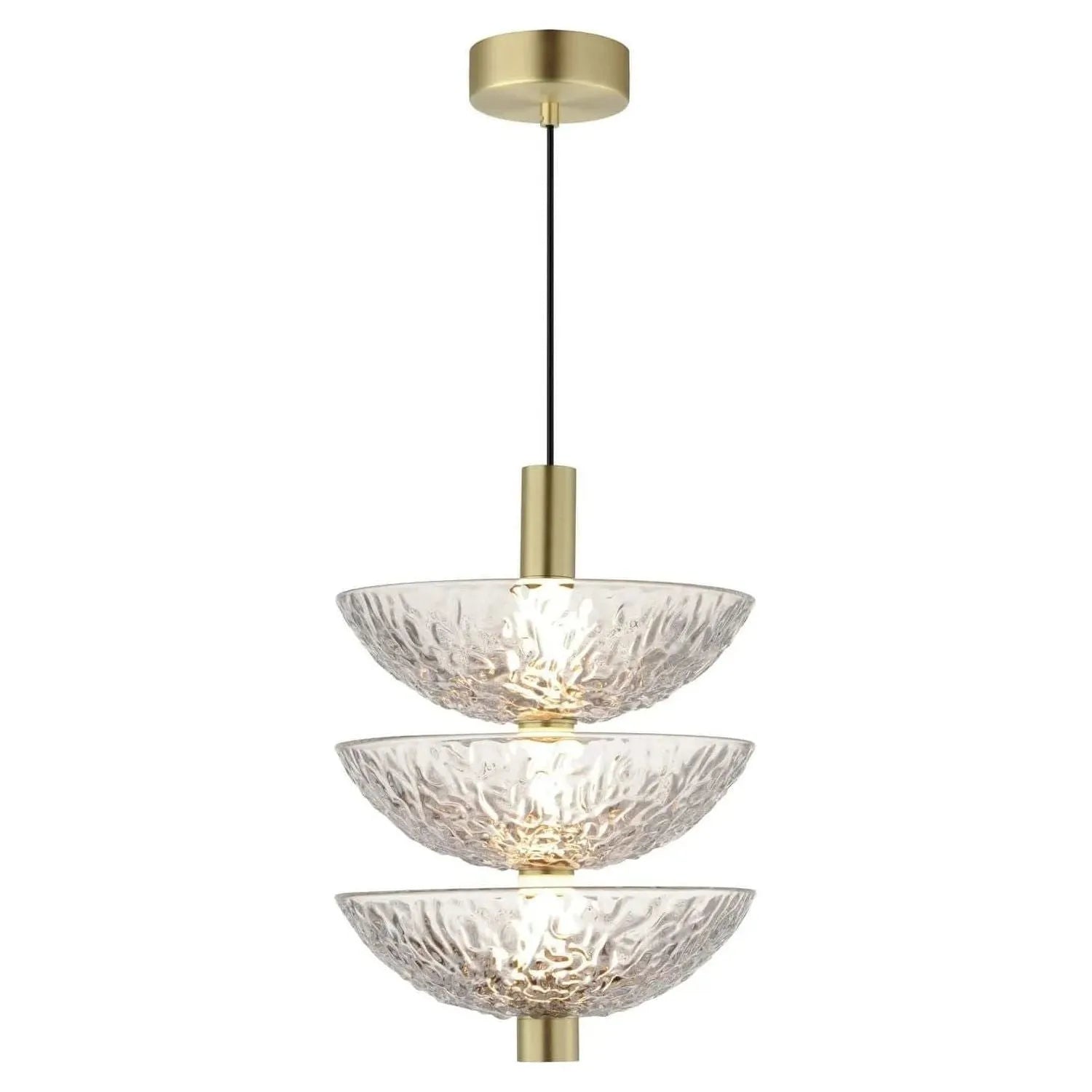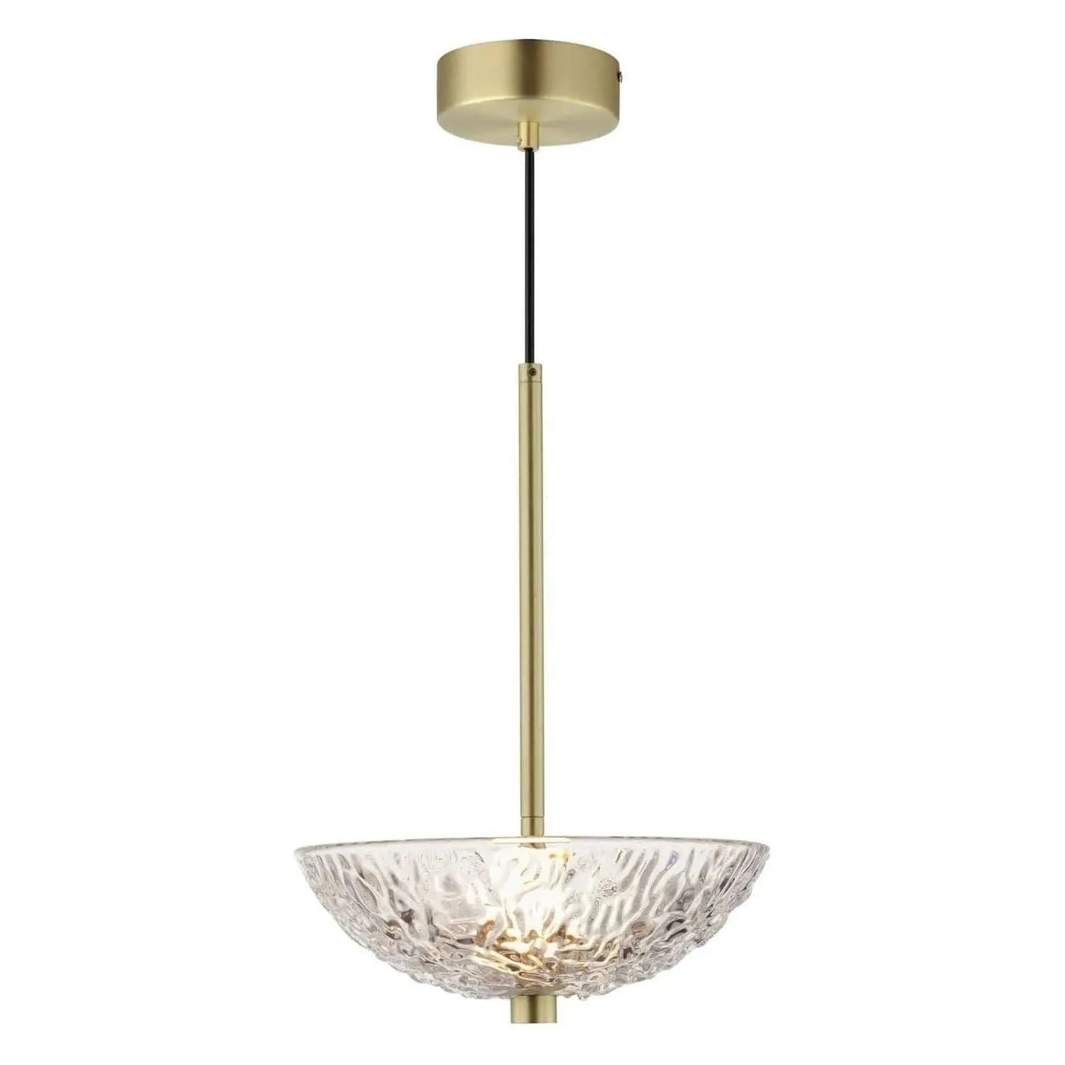 A modern take on the classic torchiere, the bright Satin Brass frames support thick textured glass cauldrons illuminated with dedicated LED modules. The 2-Light pendant and swing arm pin-up sconce feature rotatable shades directing the light either upward or cast directionally downward. The deep pattern in the glass sparks curiosity and fascination with its organic and abstract surface. It creates interest in the LED light source behind it while casting even light through the artistic vessels` design. Available in various configurations of pendants and sconces, the collection celebrates classic design concepts in an understated contemporary glamor that results in a composition suited to transitional and contemporary aesthetics. Make a statement with the oversized with the 3-light sconce nearly five foot in height or use the multiple functional pieces for reading our over an island.