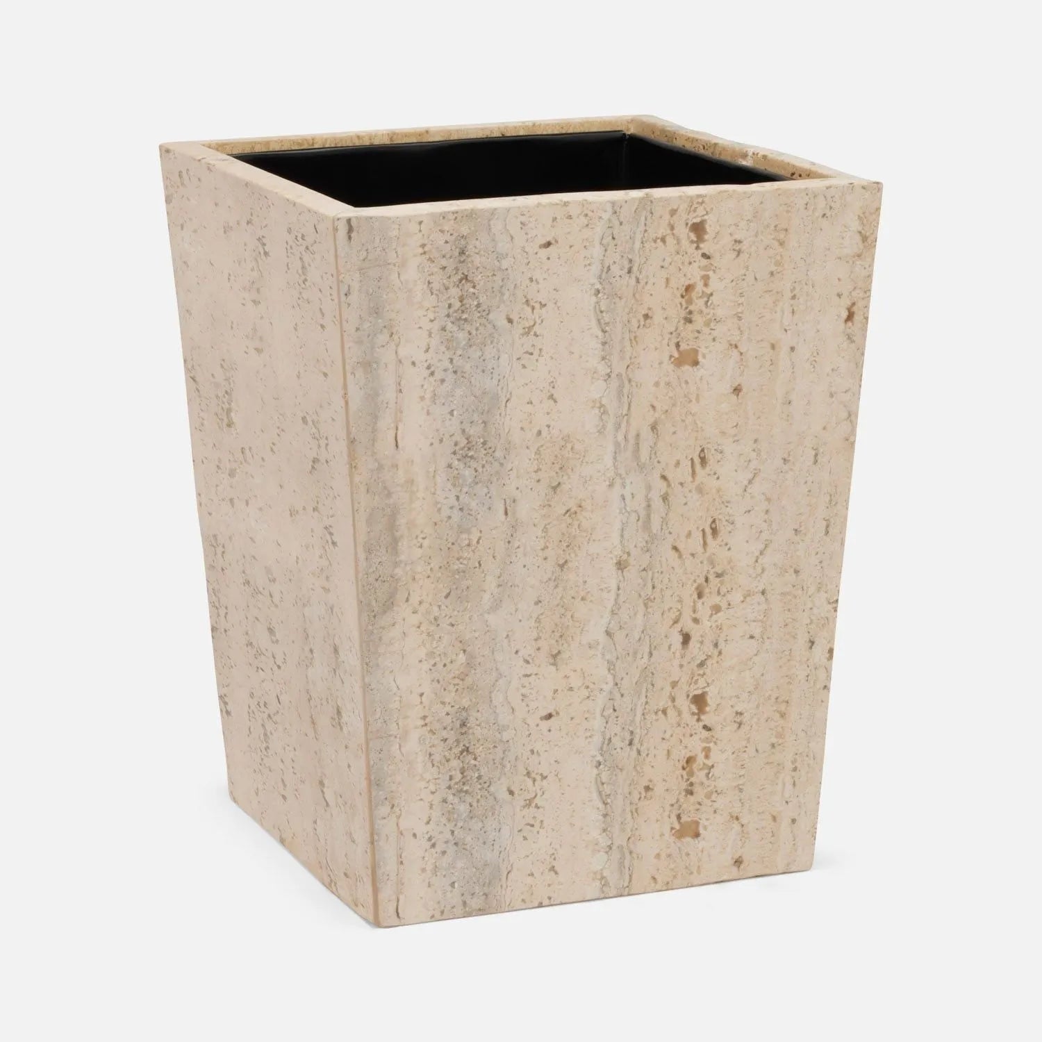 The stone Bowen bath collection celebrates the natural grain and porous texture of travertine material. The stone is filled with clear resin for a smooth finish.