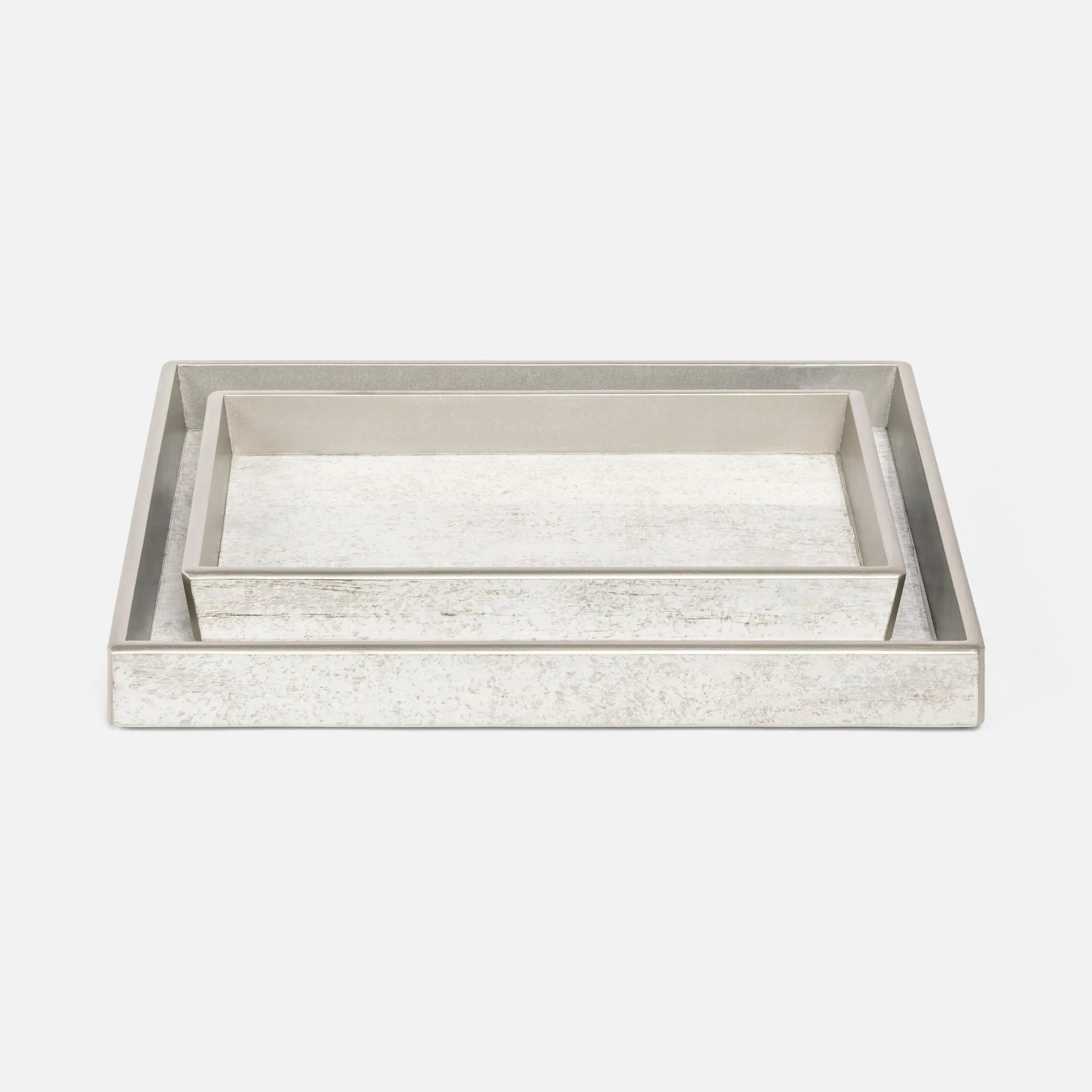 Antiqued mirror is crafted to replicate a Metallic Frost finish. Rounded edges complete the look.