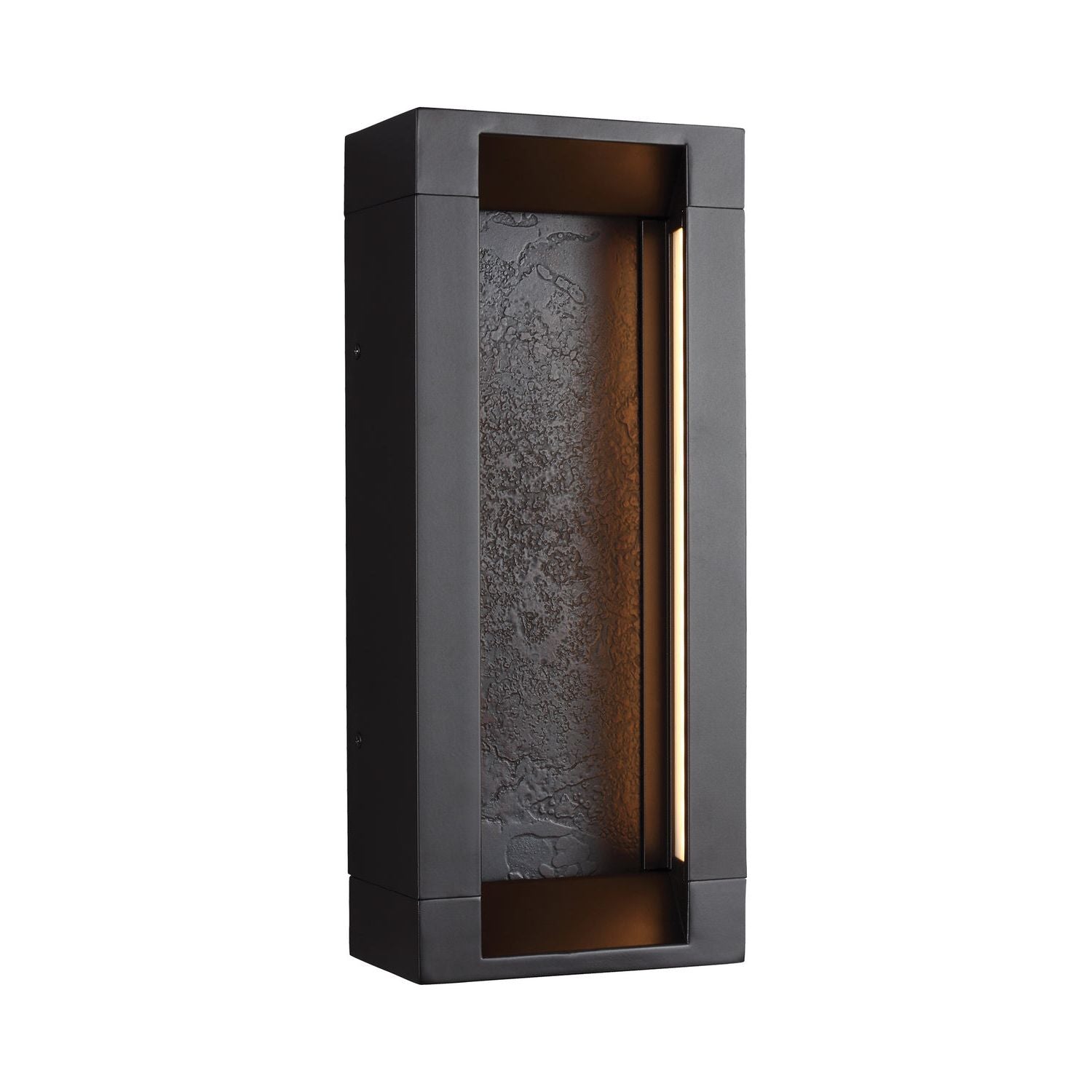 The Sean Lavin Mattix one light outdoor wall fixture in oil rubbed bronze creates a warm and inviting welcome presentation for your home's exterior. The Mattix outdoor lighting collection by Sean Lavin combines exemplary engineering and beautiful modern design into wall sconces unlike any others. Vertically recessed LED light softly grazes across recessed inserts, unique with rich texture. The Oil Rubbed Bronze finish of the sleek outer frame is paired with a metal insert specially treated to create a heavily textured, organic pattern. The Painted Silver finish complements a clear glass insert deeply carved, vertically, to suggest a waterfall. While rated for outdoor lighting use, Mattix wall sconces can also be used for indoor applications, such as a media room where soft accent lighting versus task lighting is preferred. The line includes three, varying sizes of outdoor lighting wall sconces. ADA compliant.