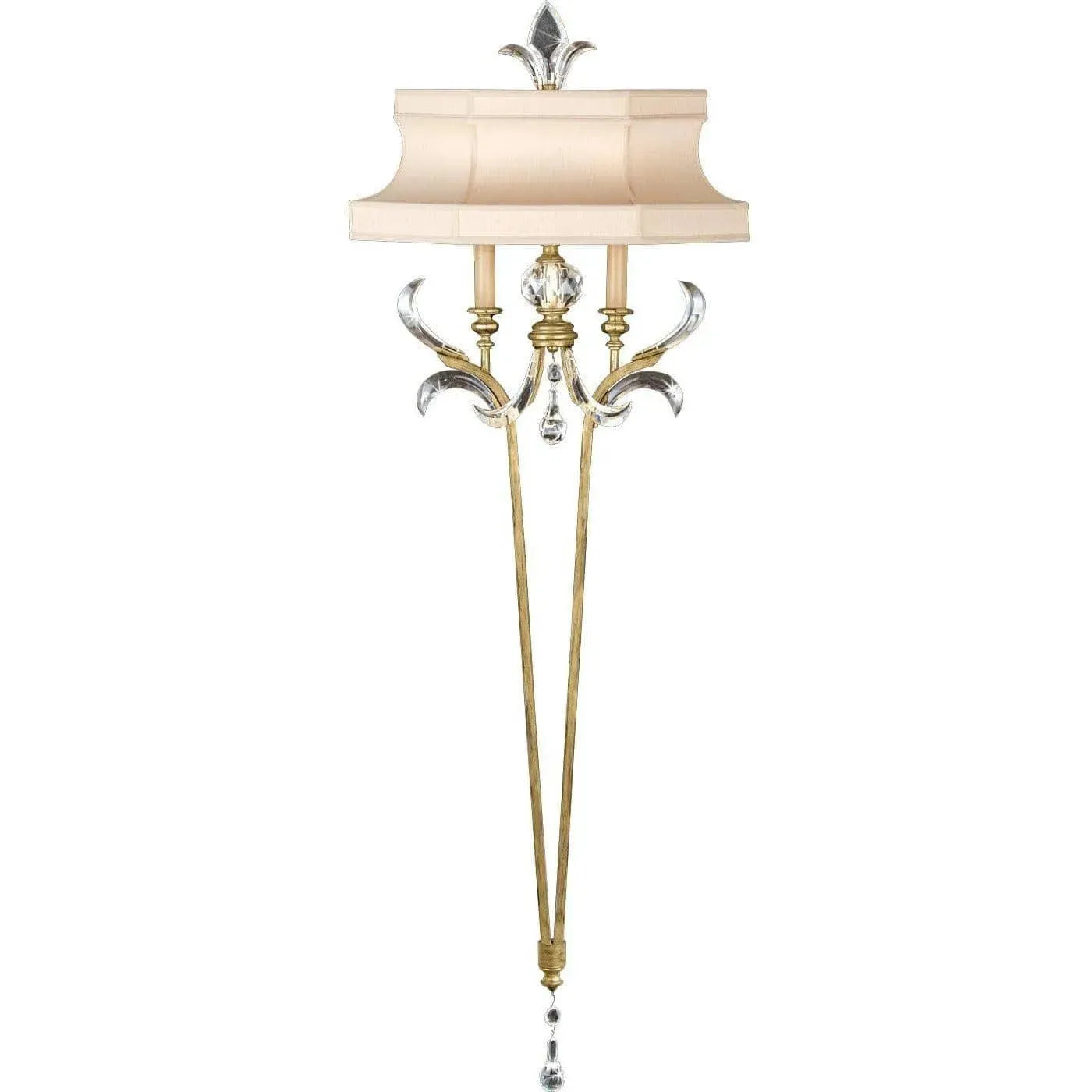 Beveled Arcs 66-Inch Two Light Wall Sconce by Fine Art Handcrafted Lighting makes a deliberate sculptural statement: a 66" vertical profile with elegant beveled glass arcs and a tailored fabric shade that balances form and illumination. This two-light wall sconce pairs slender, gilded metal rods with precision-cut glass accents and crystal drops for refined sparkle and directional glow.