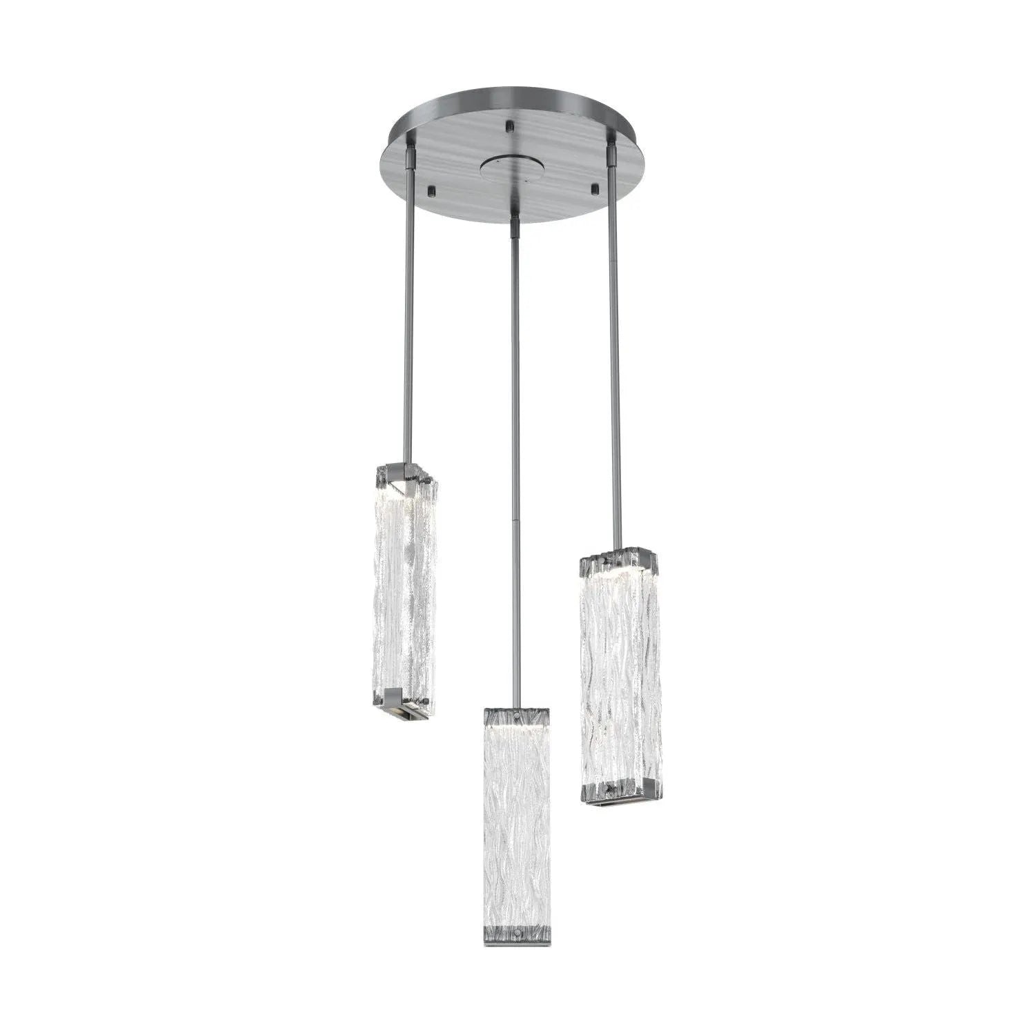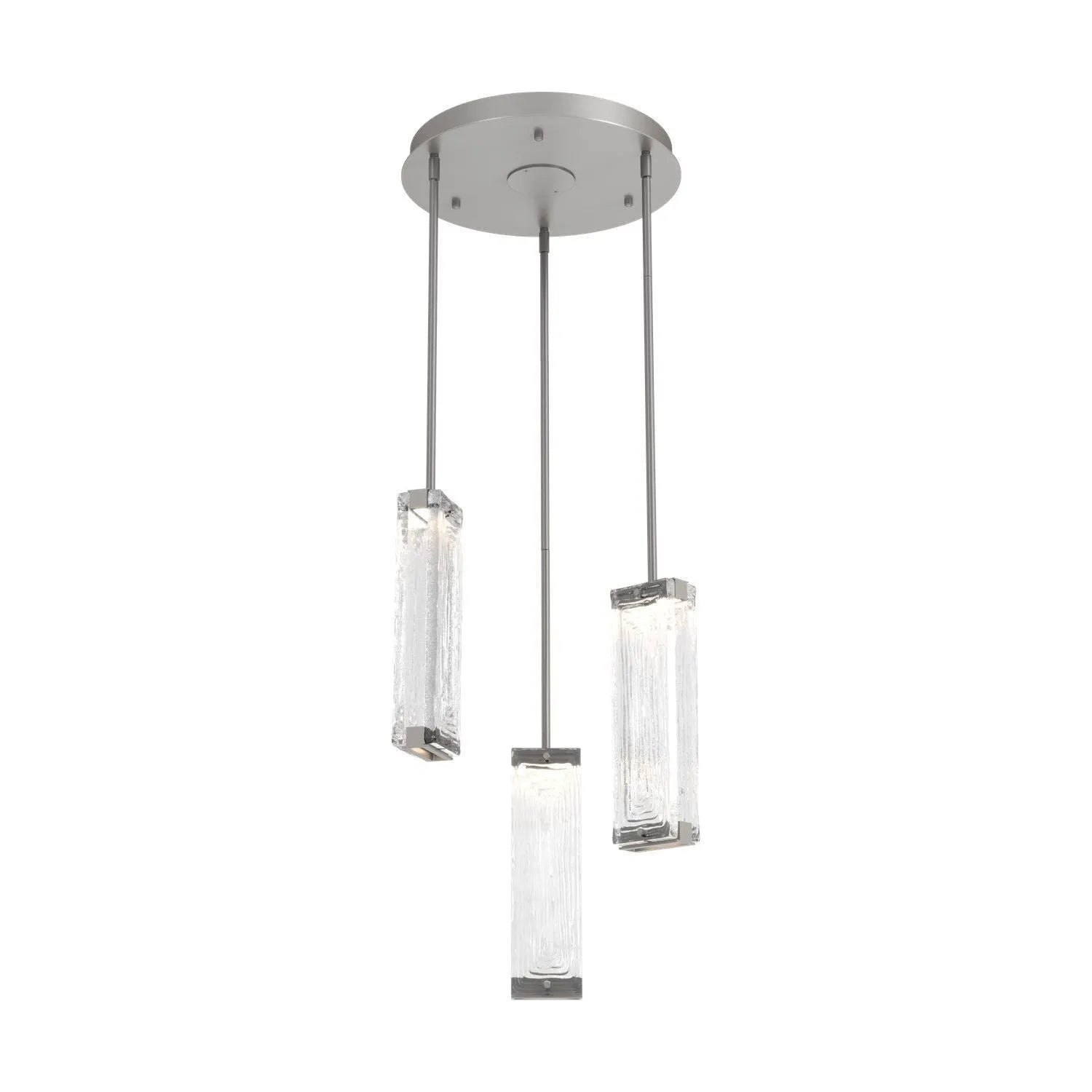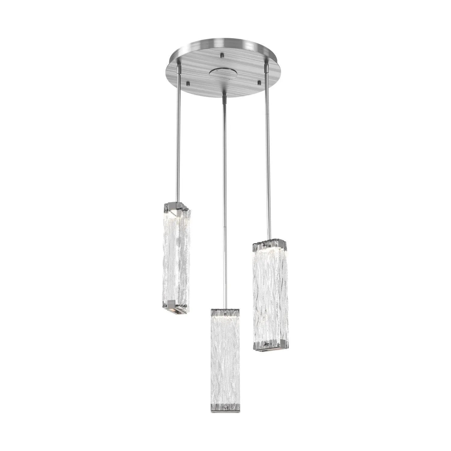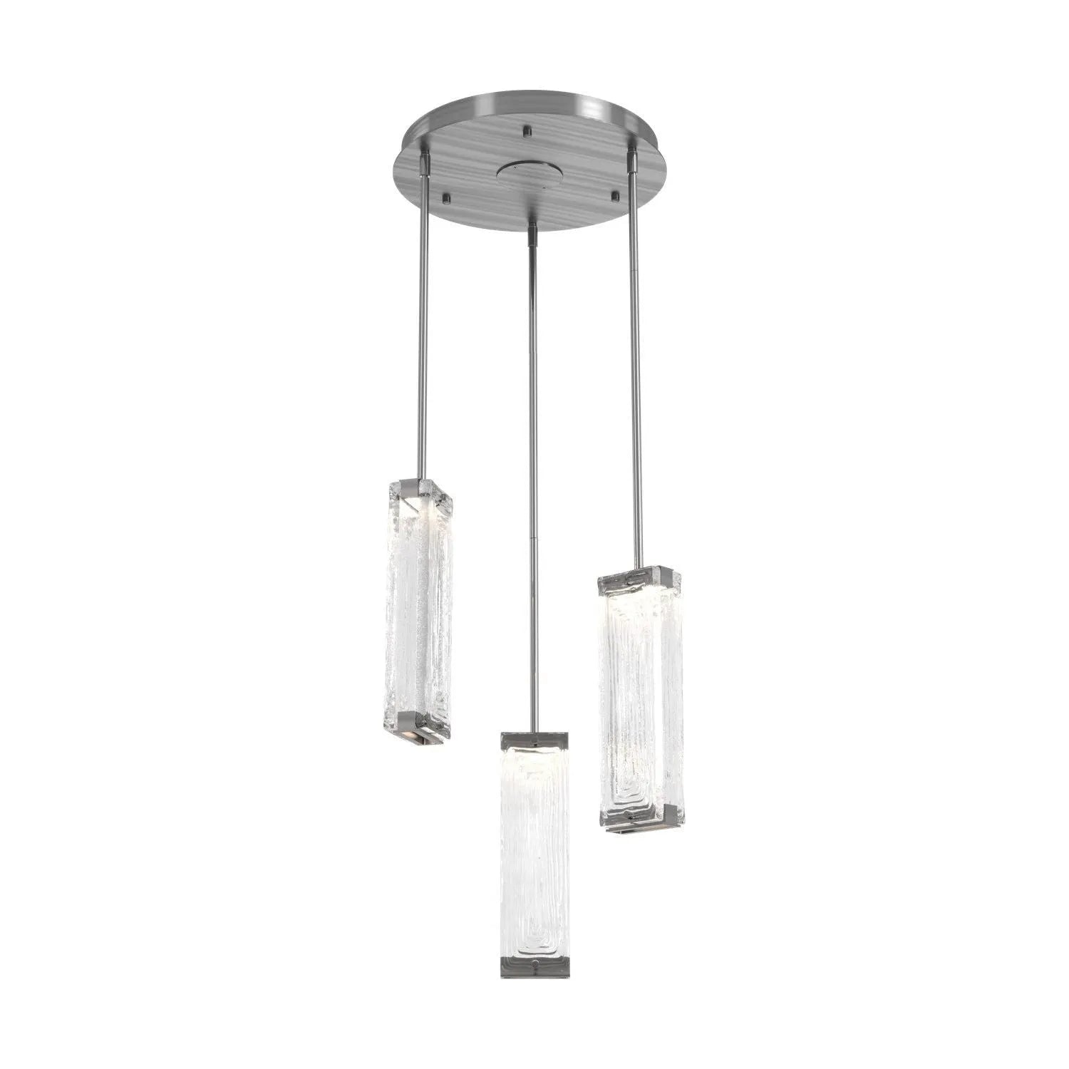 Luxuriously thick artisan cast crystal glass provides a canvas for intriguing textures that beautifully reflect and refract light in the Tabulo 3 pendant chandelier. Each glass panel weighs over five pounds. Tabulo lighting is illuminated with 93+ CRI integrated LED.