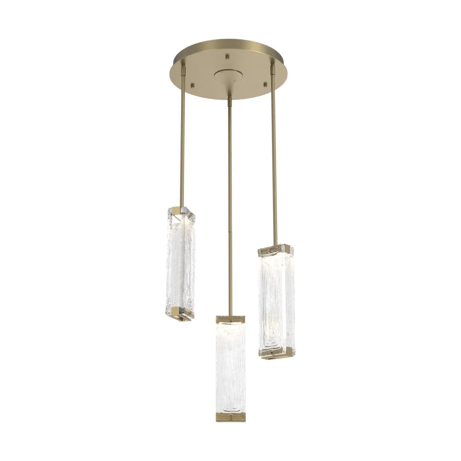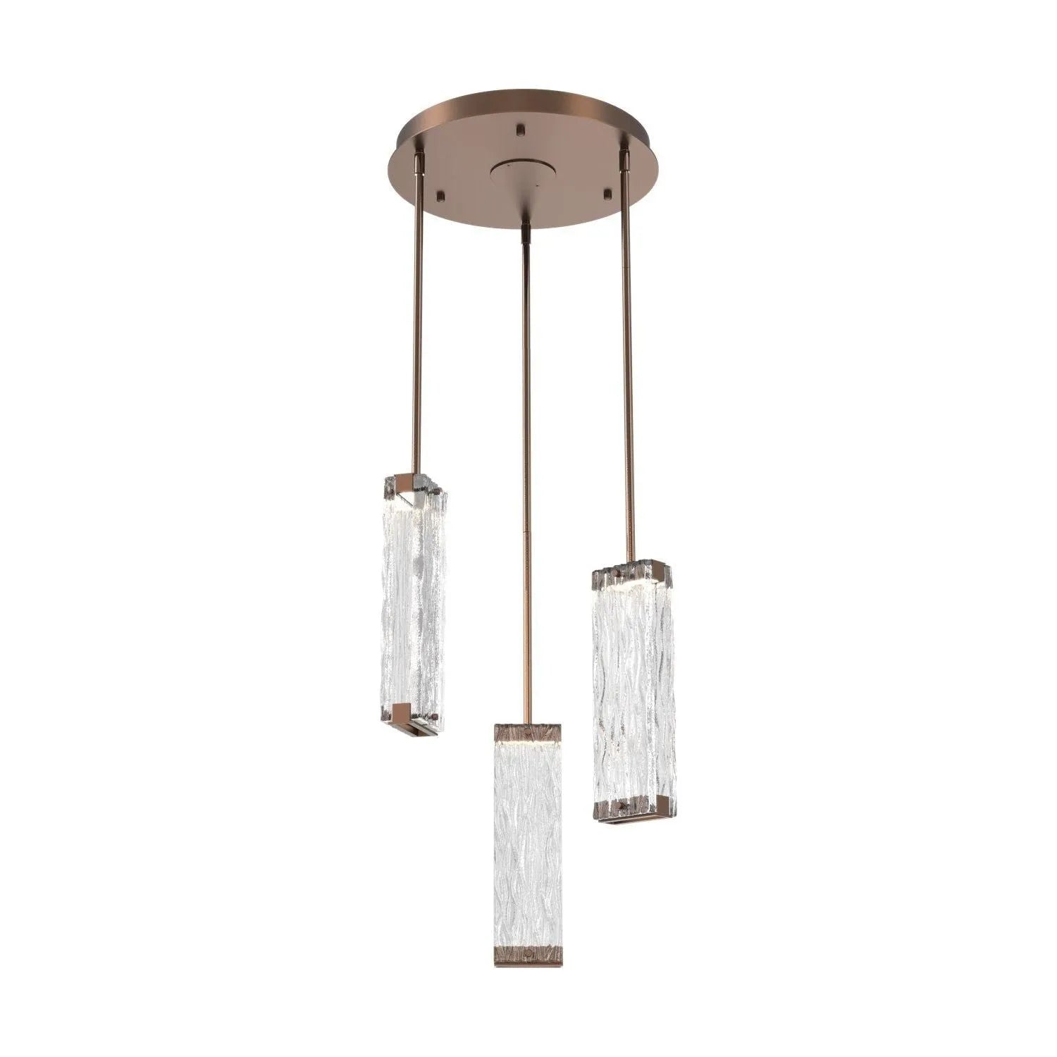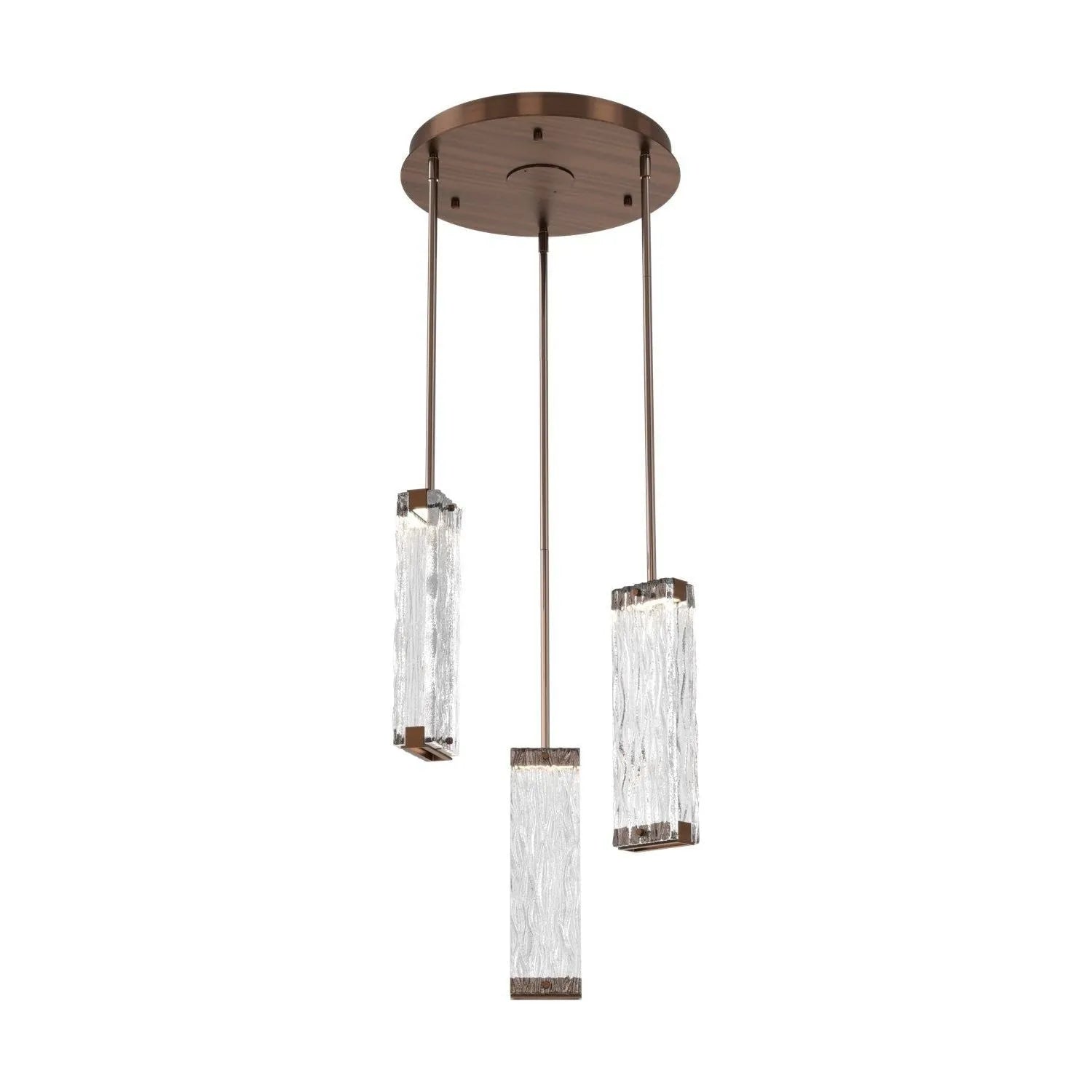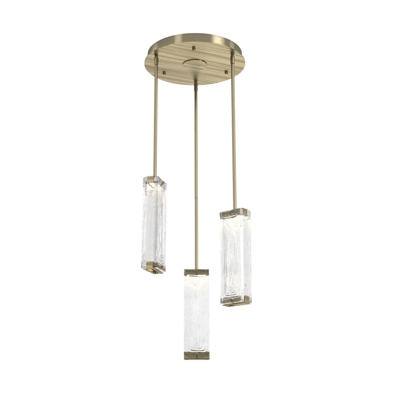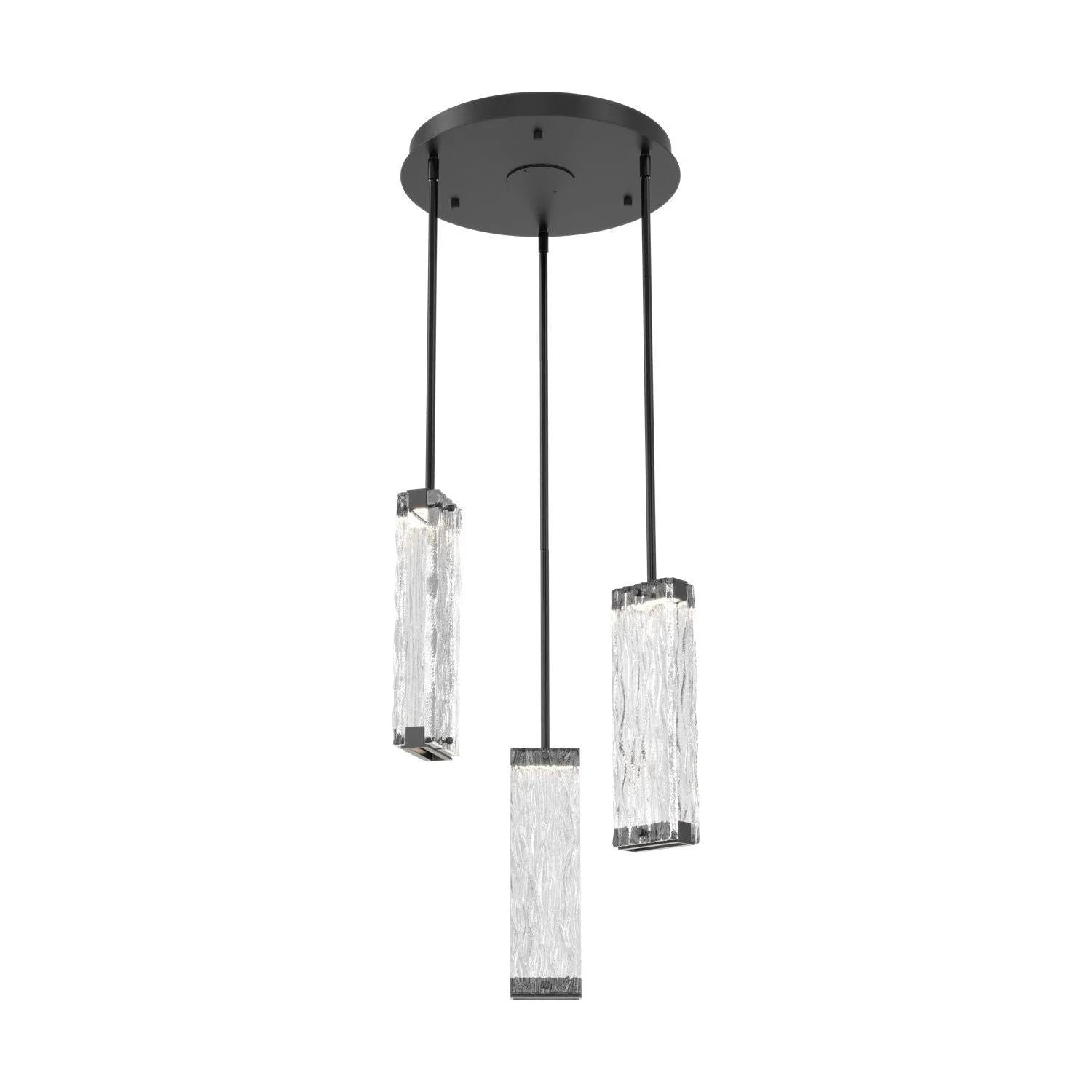 Luxuriously thick artisan cast crystal glass provides a canvas for intriguing textures that beautifully reflect and refract light in the Tabulo 3 pendant chandelier. Each glass panel weighs over five pounds. Tabulo lighting is illuminated with 93+ CRI integrated LED.
