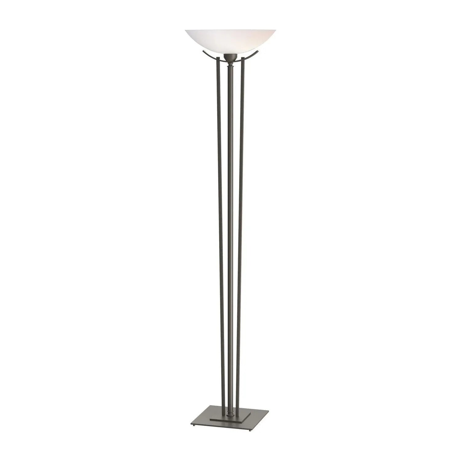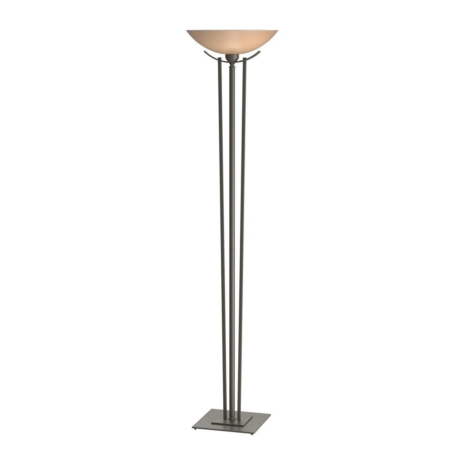 Taking a cue from the tall ornamental stands for candlesticks from long ago, our Torchiere rises to the height of elegance with two rods of steel escorting the steel tube up to the glass bowl.