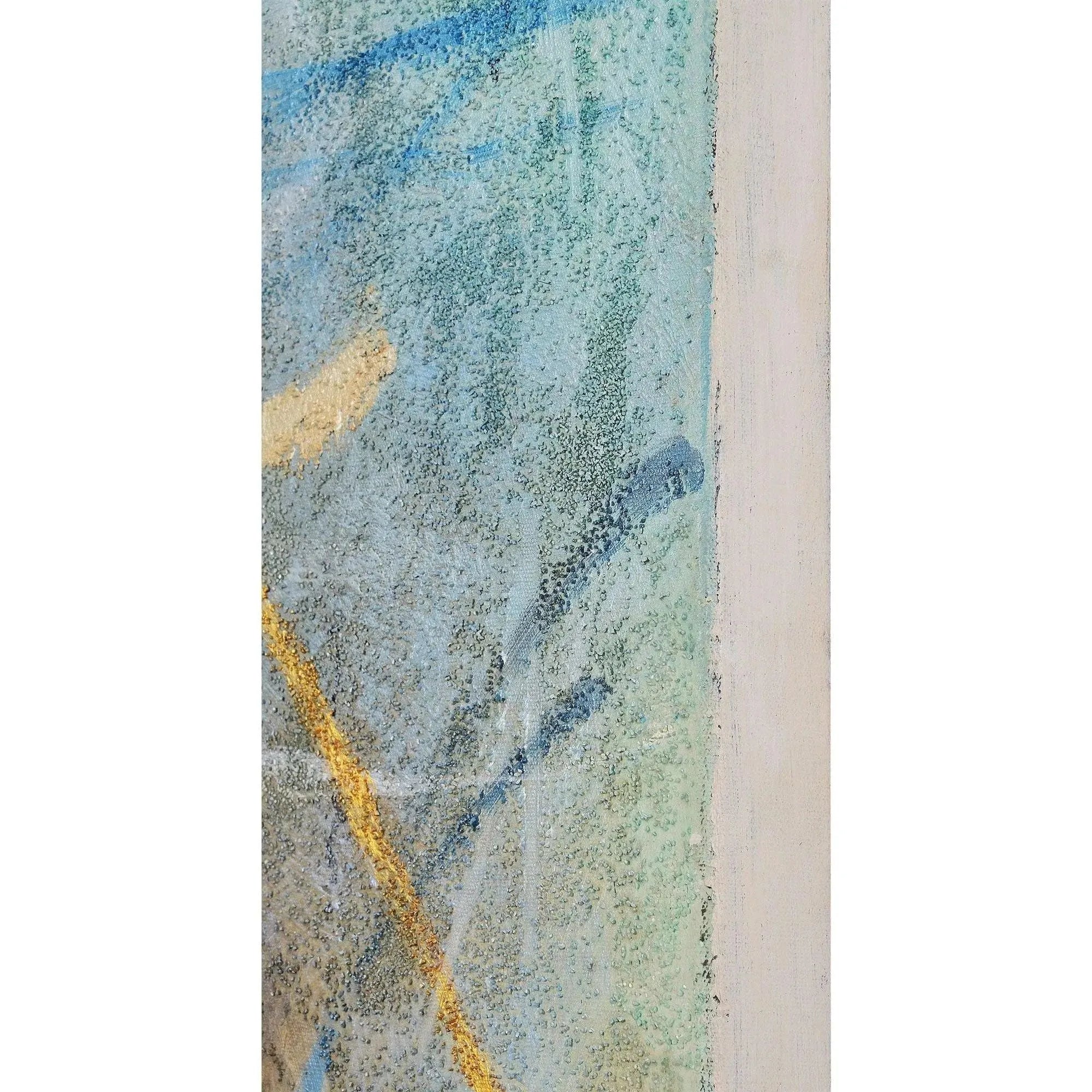 These abstract art paintings invite passersby to create their own story from the twists and turns on each canvas. This set of two works of art can hang vertically or horizontally, together or apart, whatever best suits your client's desire. Best suited for the creative interior, the blue and gold tones in the palette exude a vibrancy that pours out into the room it rests within.