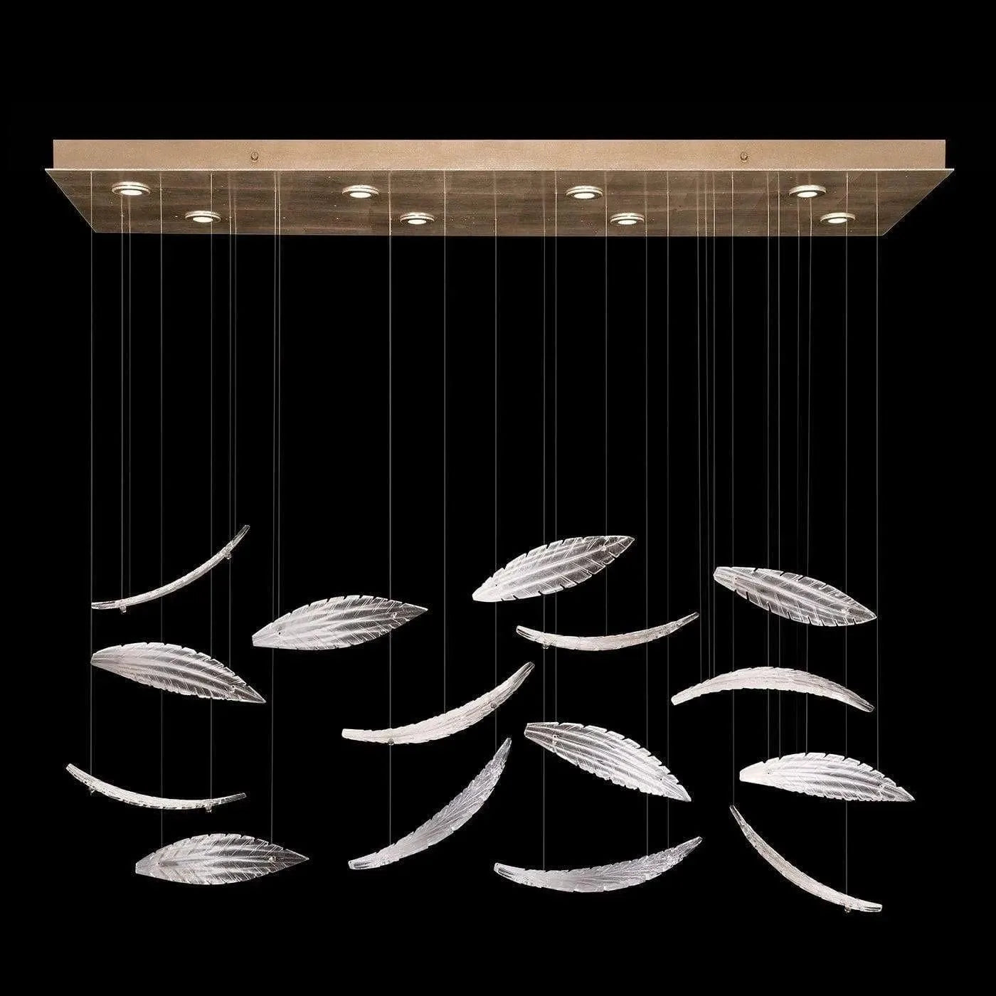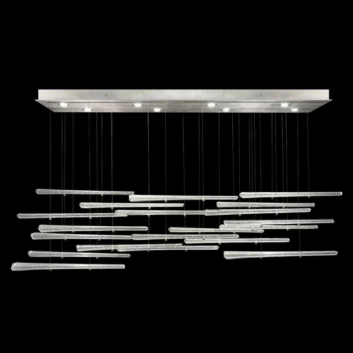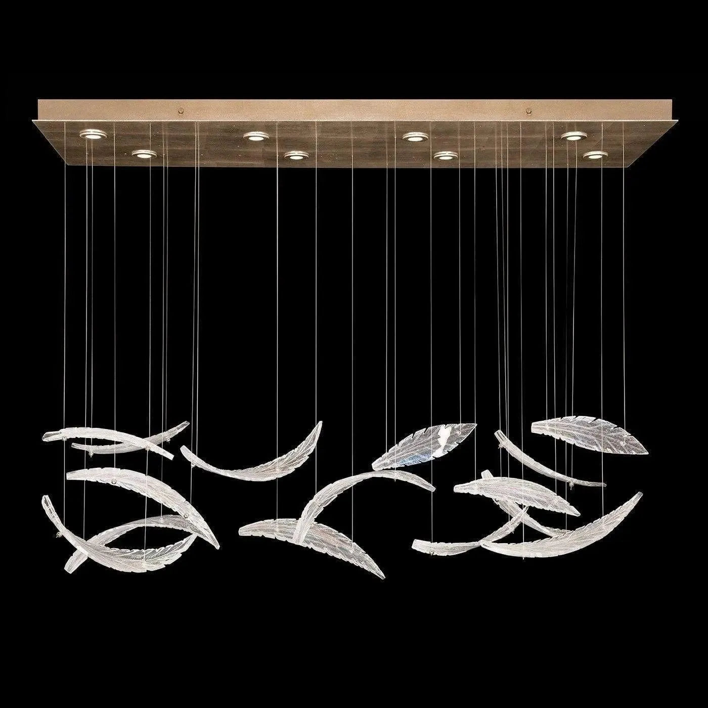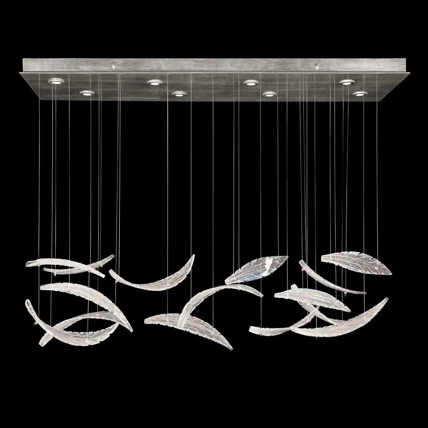 Elevate raises your environment to new heights. Each "plume" is handblown and sculpted with a translucent mixture of clear crystal and opaline glass accented by our signature dichroic glass, creating a shimmer of color in each ray of light. Illuminated with integrated LED's from a silver leaf canopy and suspended by adjustable cables, this Made in America rectangular fixture features 15 handblown glass "plume"s and is ideal for low ceilings. Shown in a "horizontal" design.
