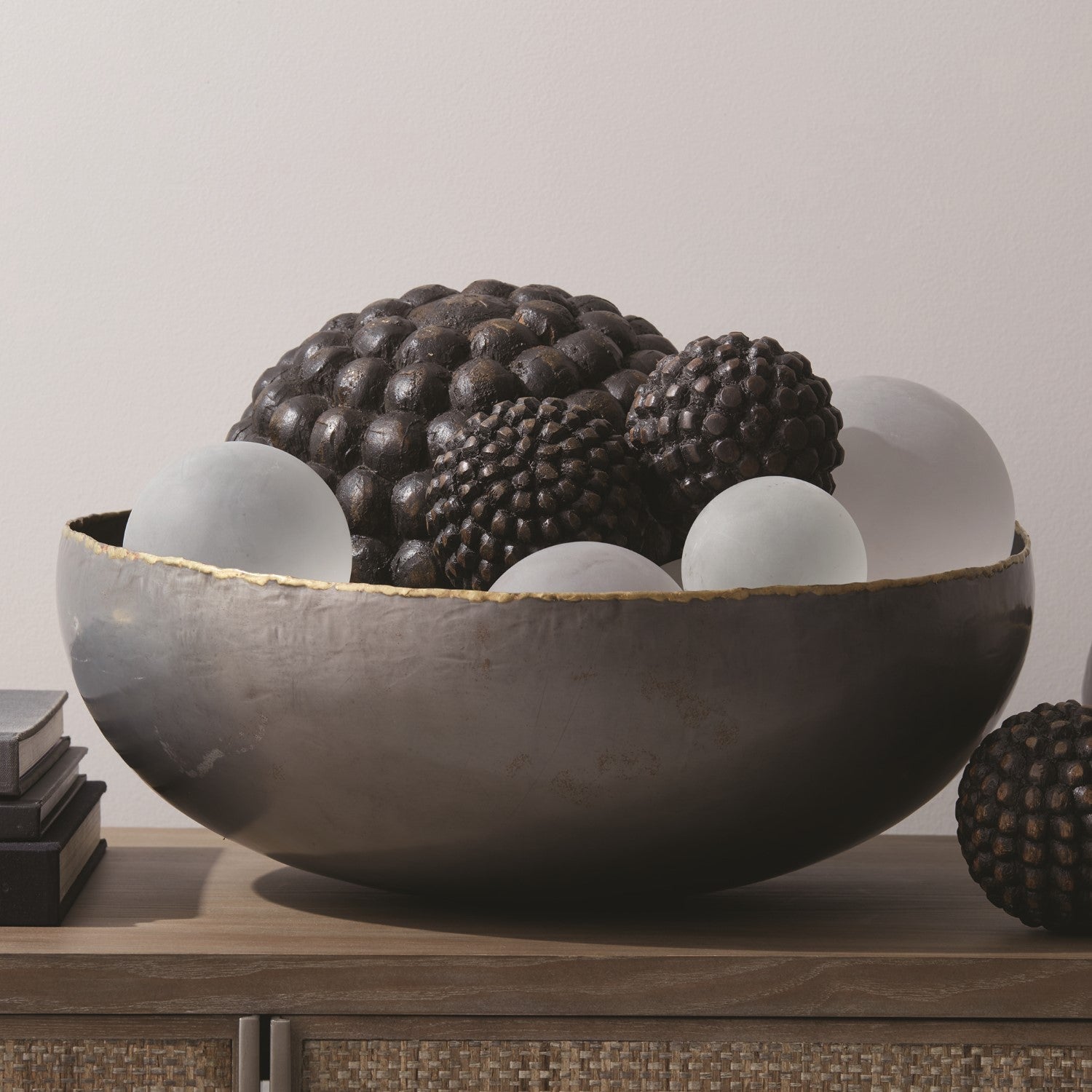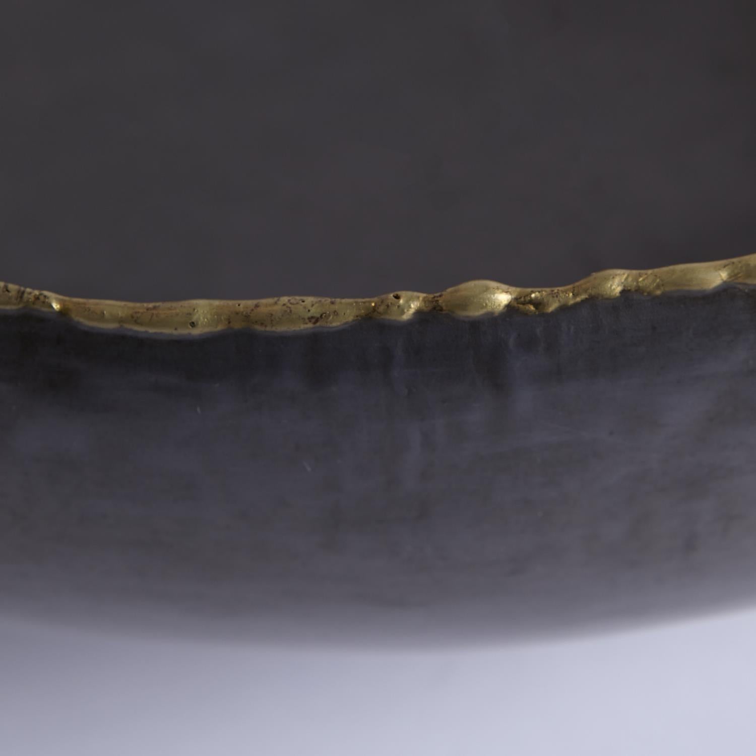 Brutalist iron centerpiece bowl with braised brass accent on edges. The bowl is sealed with a matte lacquer to retard oxidation.