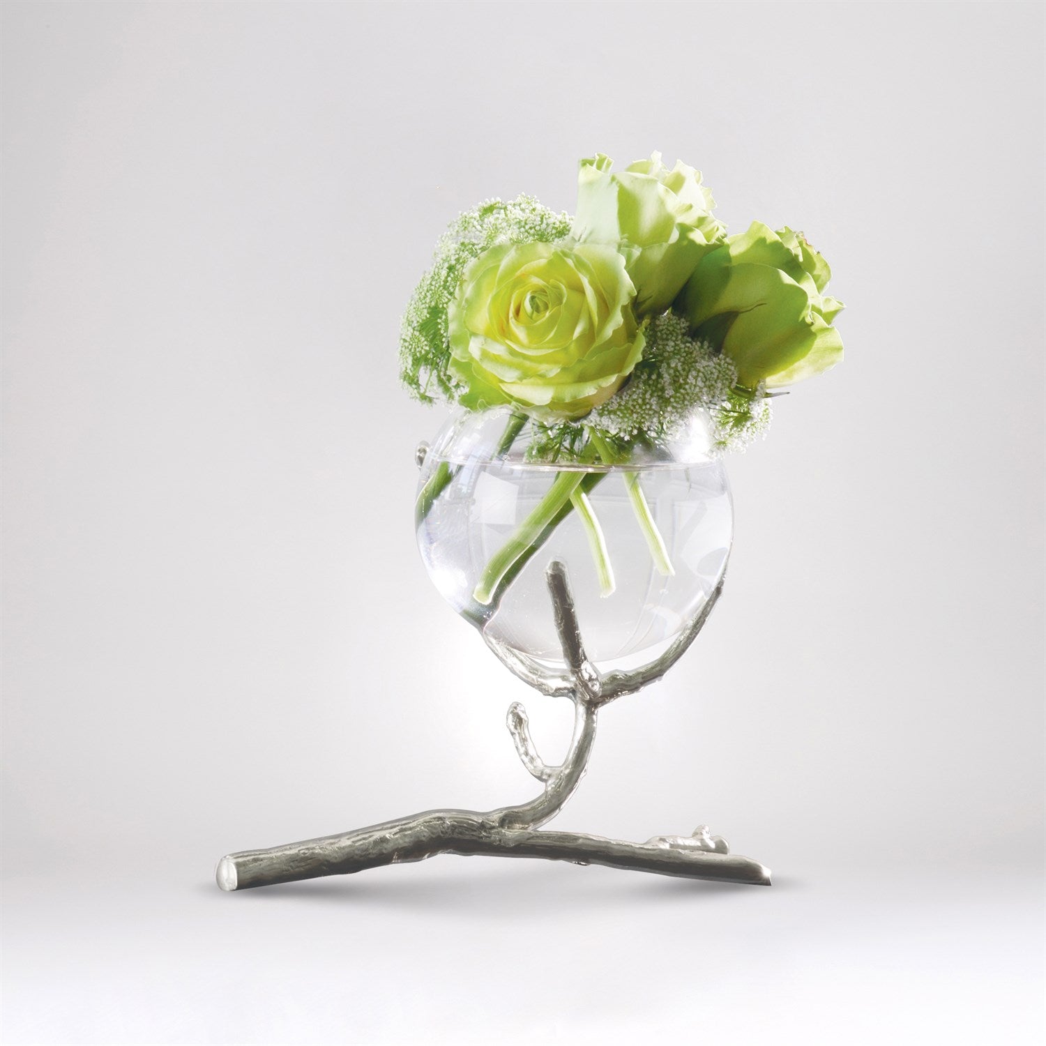 Stems of solid sand-cast brass twist and turn creating our Twig Vase Holders. These delicate vase holders have taken natural elements and turned them into glowing artful accessories. The glass bulb-shaped vases display small buds beautifully. Display one piece for a simple look or show all three sizes together for a dramatic tablescape. Available in three sizes: Large 3-vase holder, Medium 2-vase holder, and Small 1-vase holder. Also available in Nickel.