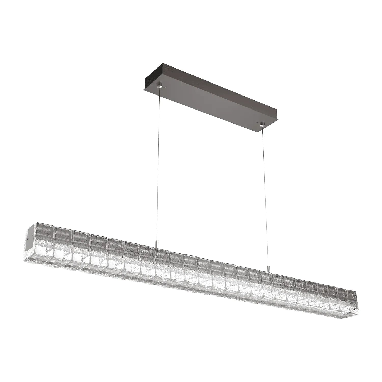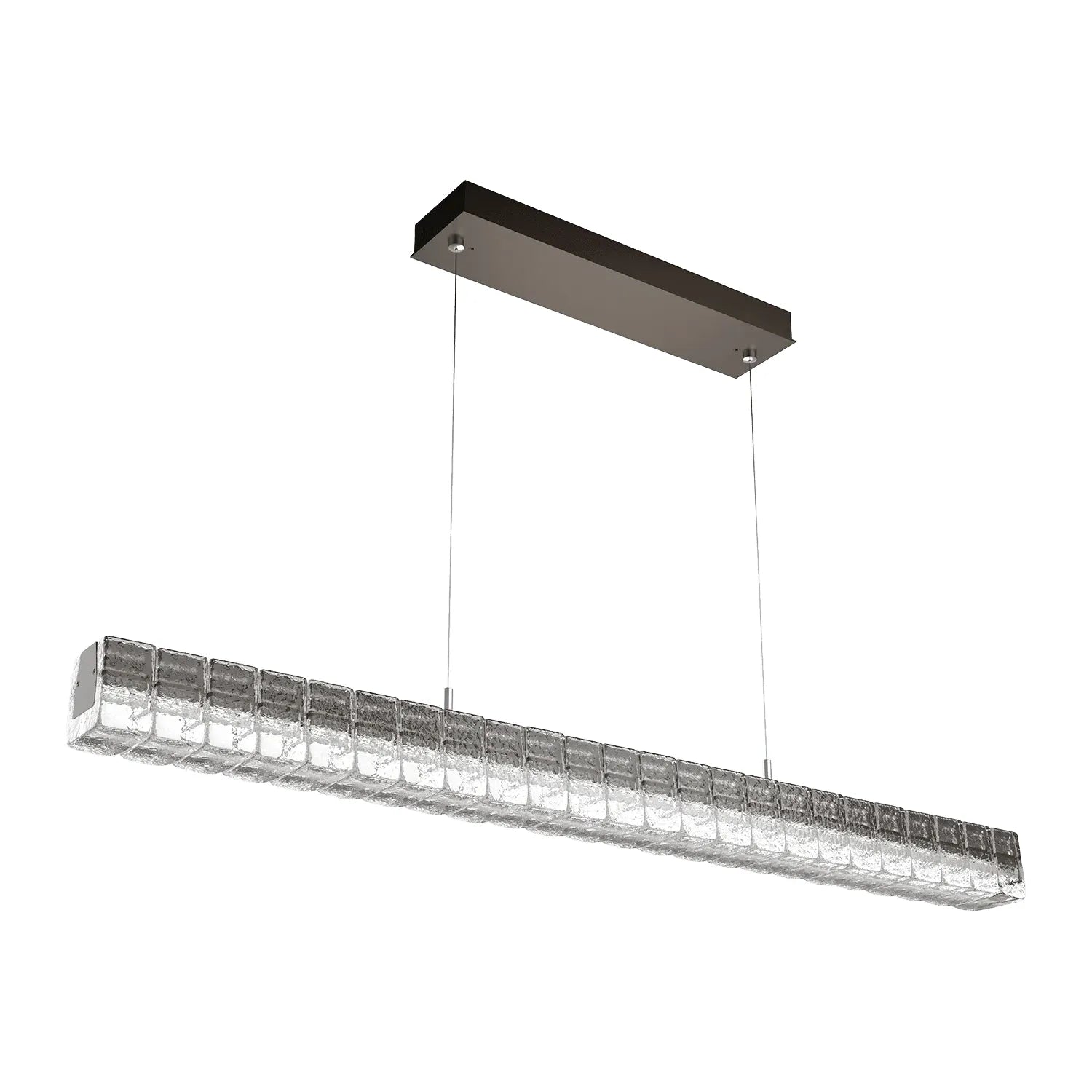 Crafted with an aluminum body, cast-glass diffuser and steel-braid cables, this fixture measures 48" W x 2" D x 3.5" H and weighs approximately 46 lbs. Integrated LEDs deliver warm, high-CRI illumination (≈3000K, CRI 90–93) with dimmable control for layered, task-to-ambient lighting.